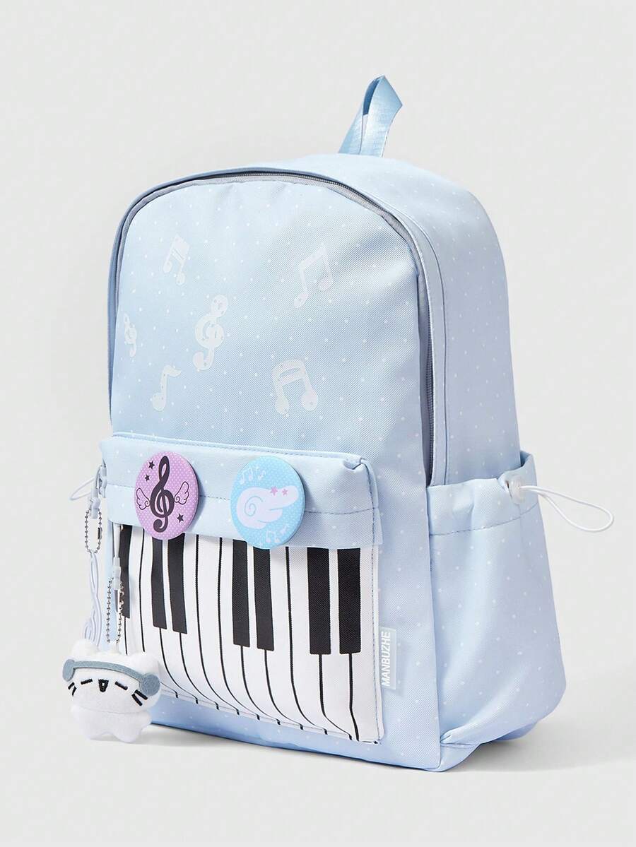 Anime 1Pc Light Blue Punk Academy Wind Polka Dots, Piano Keys, Printed Pattern, Bar Notes, Earphones, Kitten Pendant, Star Zipper, Large-Capacity Multi-Pocket Backpack, Fashionable, Simple And Casual, Neutral And Versatile Universal Backpack For Men And Women, Suitable For Commuting, School, Travel And Other Essential Items