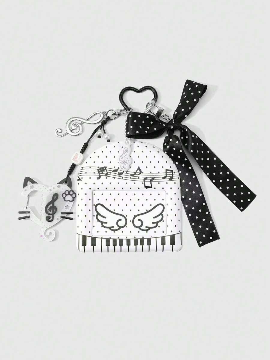 Anime 1pc Ins-Style Casual Versatile Retro Minimalist High-Quality Black & White Polka Dot Ribbon Bow Acrylic Cat Hollow Music Note Woven Leather Rope PVC Glossy Piano Keyboard Beating Note Horizontal Card Holder, Campus Card Holder, Photo Card Holder, ID Card Holder, Keychain, Bag Charm, Suitable For Women, Girls, Friends, Daily Wear, Holiday Gift