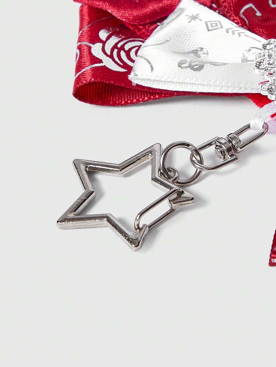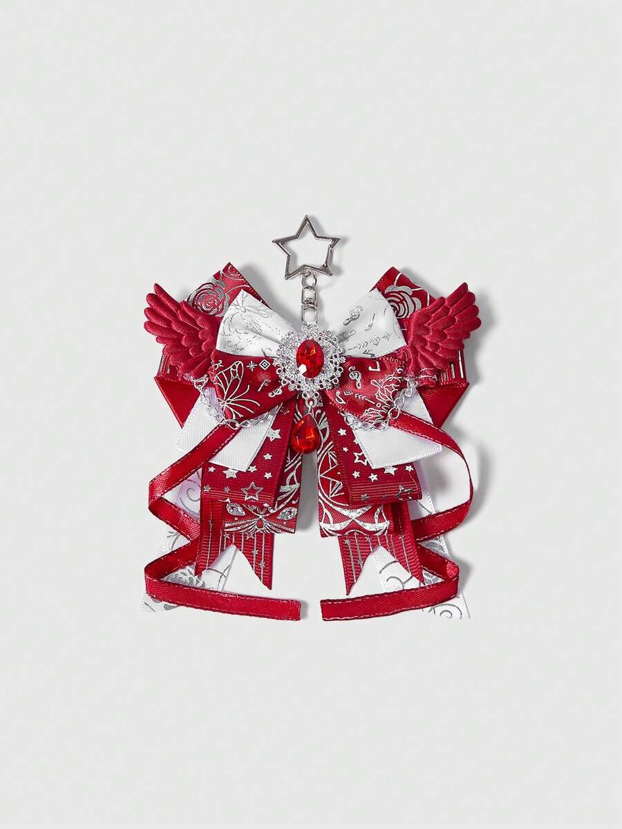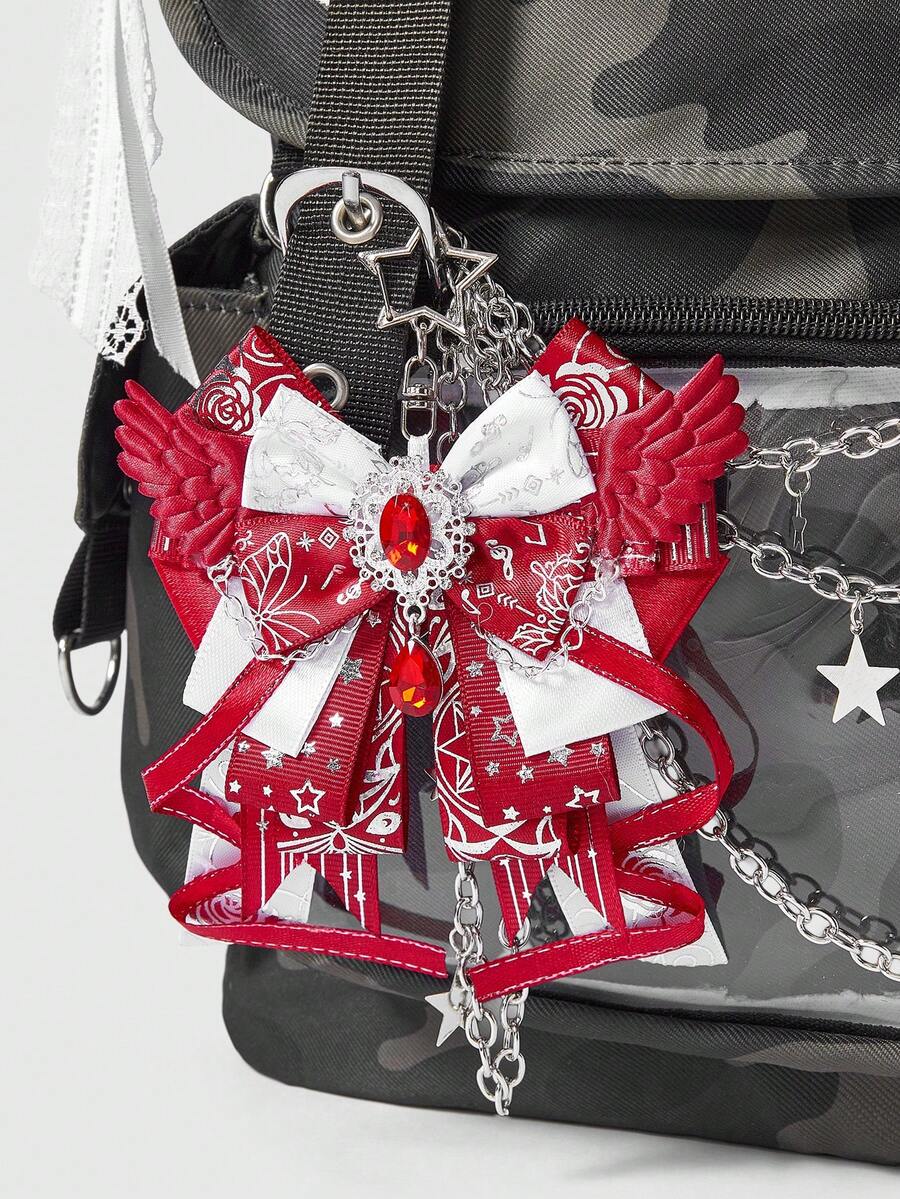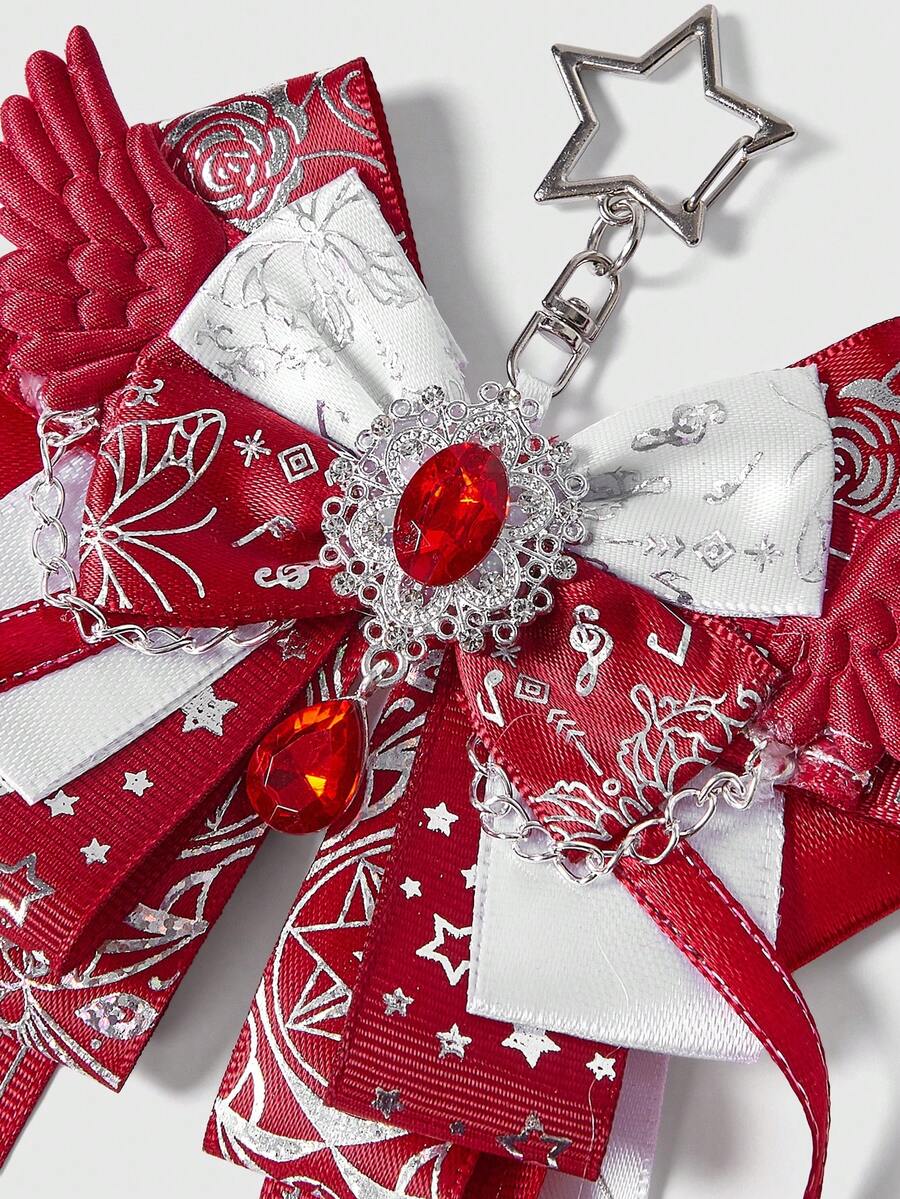 Anime 1pc Kawaii Sweet Cute Music Note Print Lace Patchwork 3D Wing Y2K Star Foil Print Bow Shaped Keychain & Keyring, Handmade Lolita Campus Card Holder Bag Charm