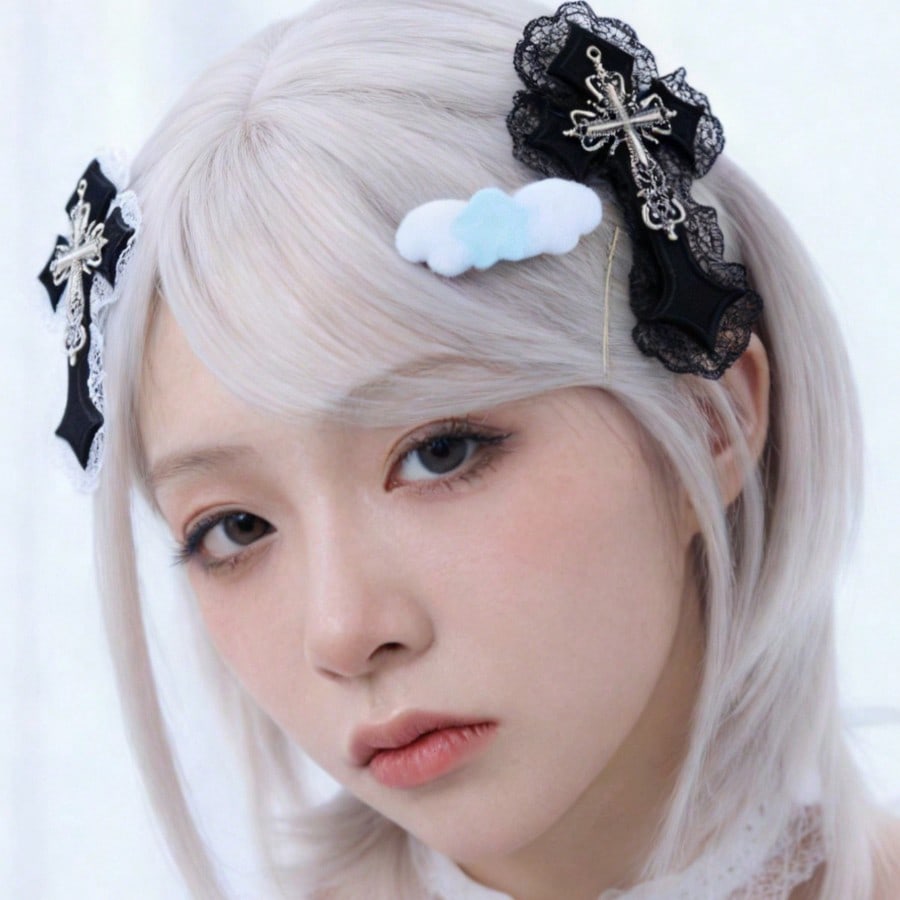 Anime 2 Pieces Dark Punk Cross Hair Clips, Gothic Lace Headpiece Y2K Spicy Girl Dark Subculture Hair Accessory