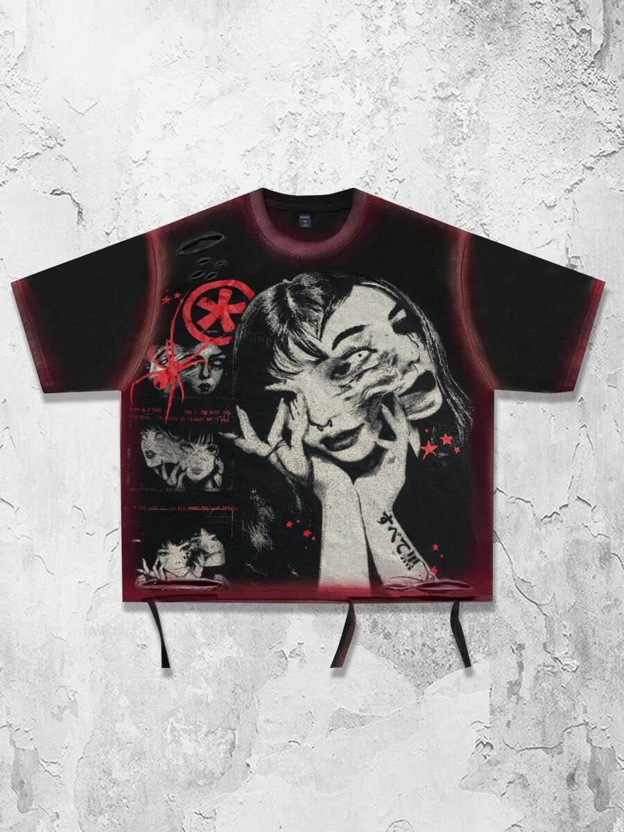 Anime 2026 Men's Casual Fashion Short Sleeve T-Shirt Top, Distressed Artistic Design, Summer; Women's Street Style Round Neck T-Shirt