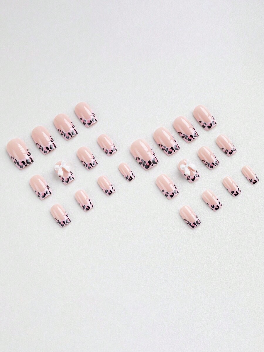 Anime 24pcs Pink French Leopard Print Bow Fake Nail Tips With A Roll Of Tape