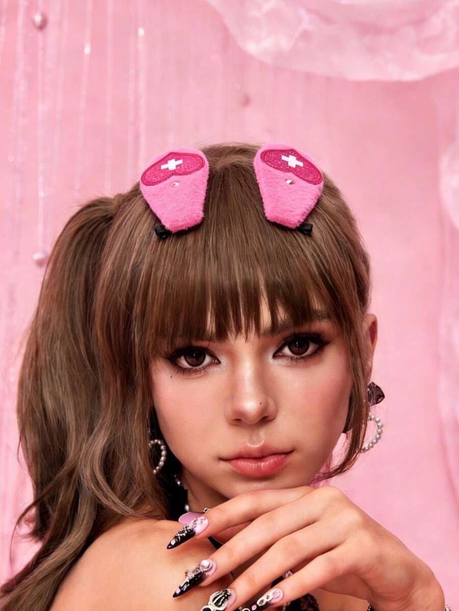 Anime 2pcs Cute Heart & Rivet Decor Hair Clips, Y2K Glitter Fluffy Rabbit Ear Duck Clip, Niche Design Fashion Hair Accessories