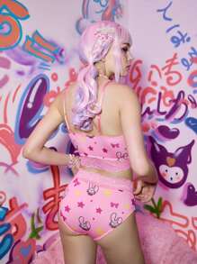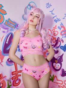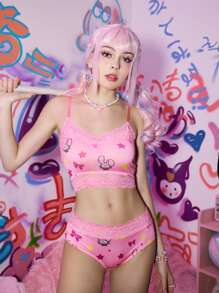 Anime Cartoon Print Contrast Lace Lingerie Set