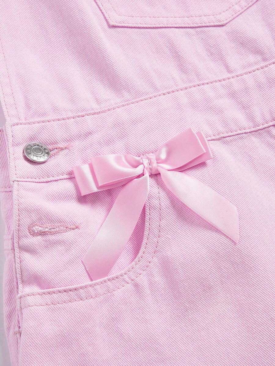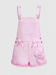 Anime Cute Cartoon Characters & Star Printed Denim Overalls With Lace Trim & Bow Decoration