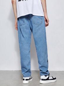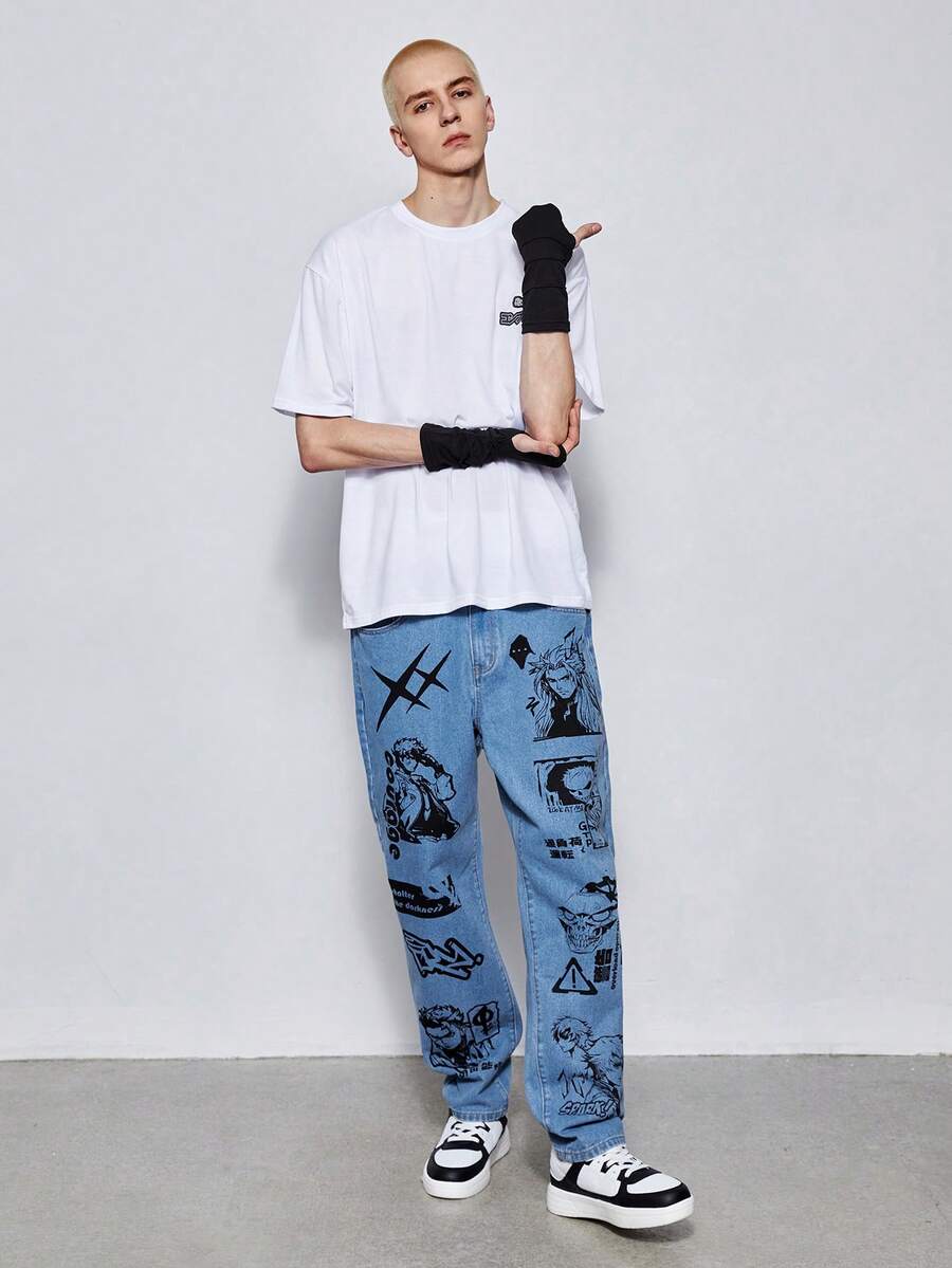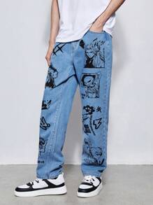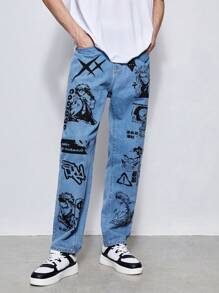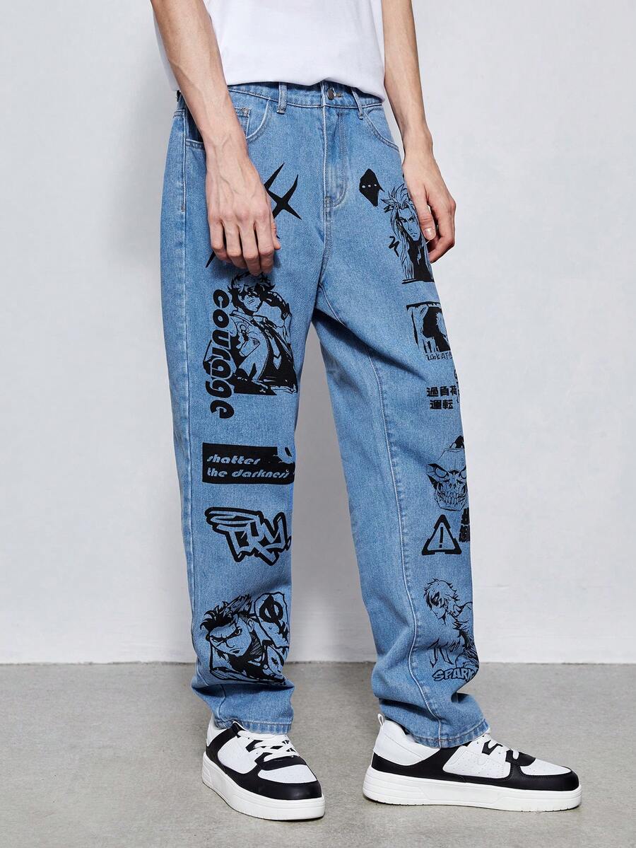Anime Guys Cotton Figure & Letter Graphic Straight Leg Jeans