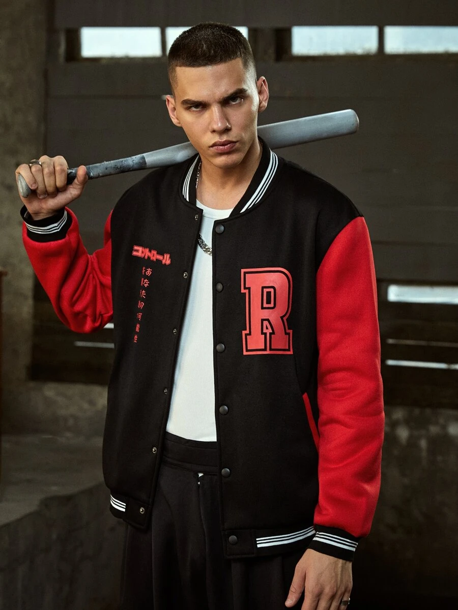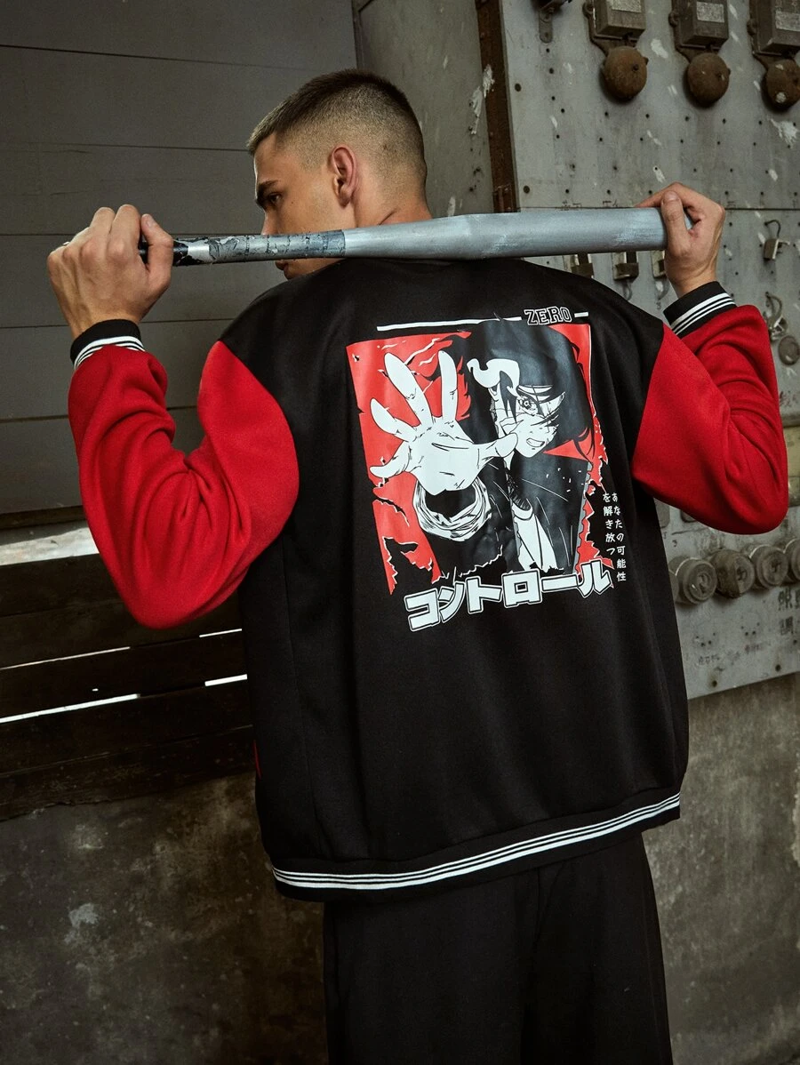 Anime Guys Letter Graphic Button Front Baseball Jacket