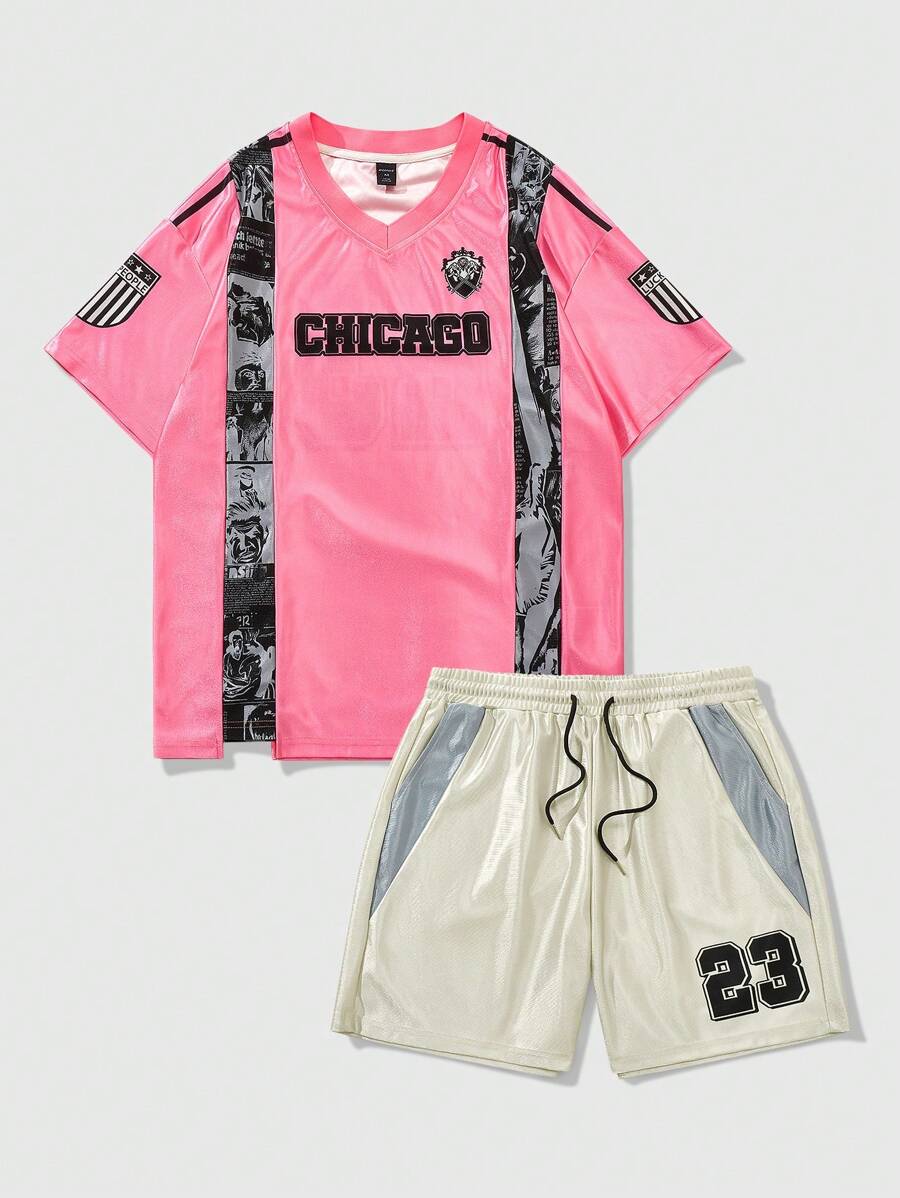 Prep Men Fashion Summer Casual Sports Numeric & English Print Design T-Shirts, American & Japanese Cartoon Style Short Loose Fit