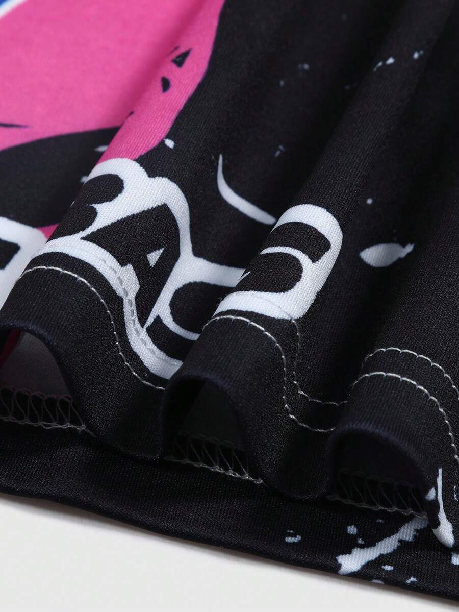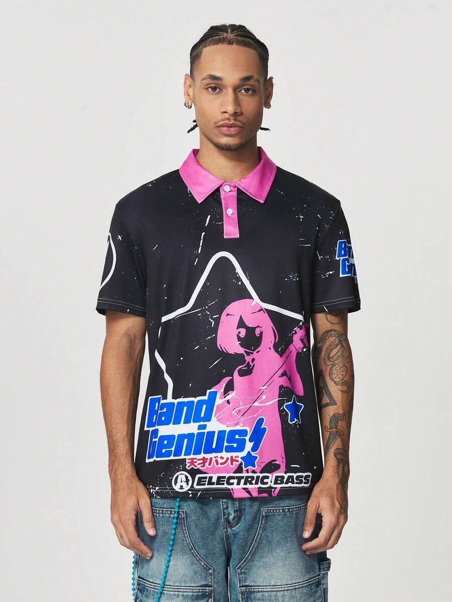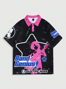 Anime Men Figure & Letter Graphic Contrast Collar Polo Shirt