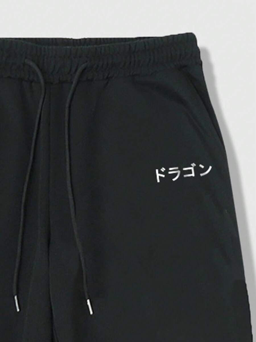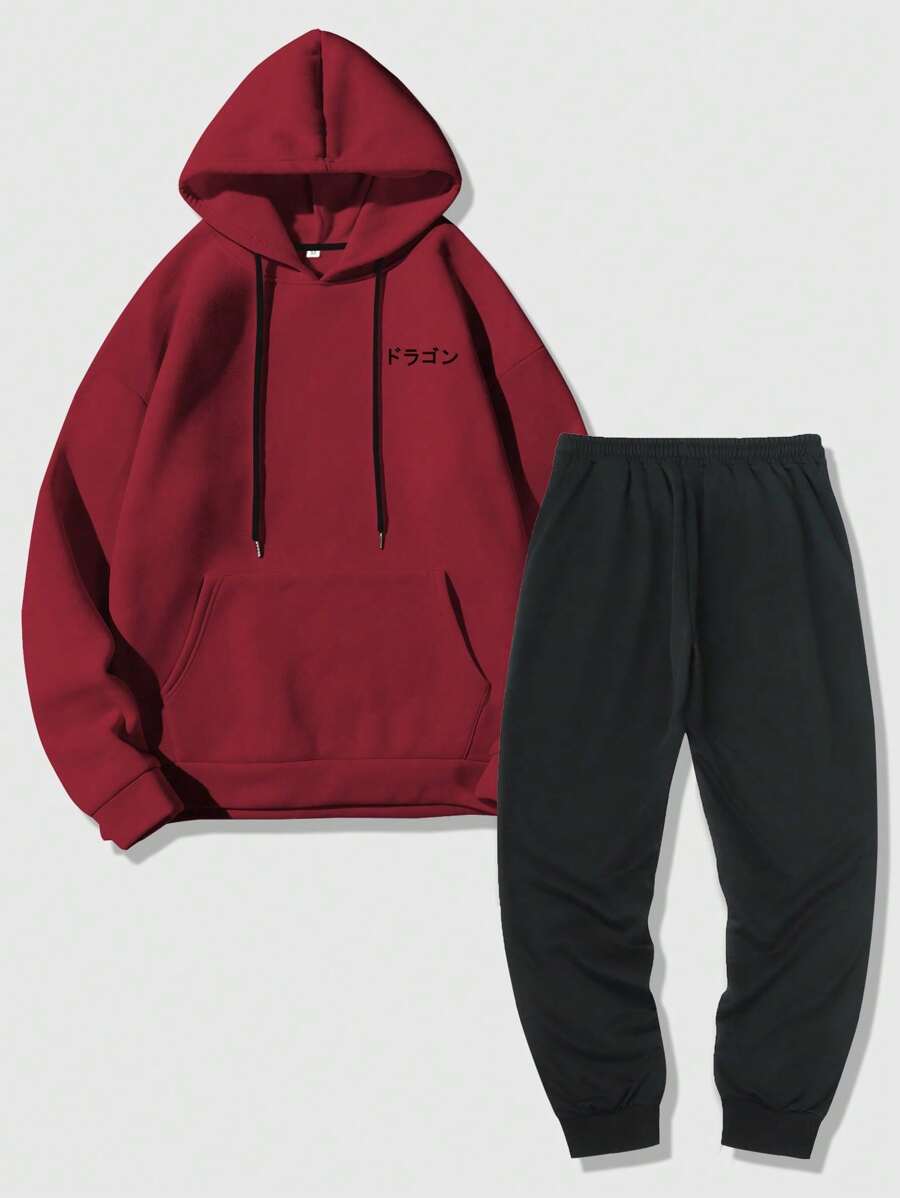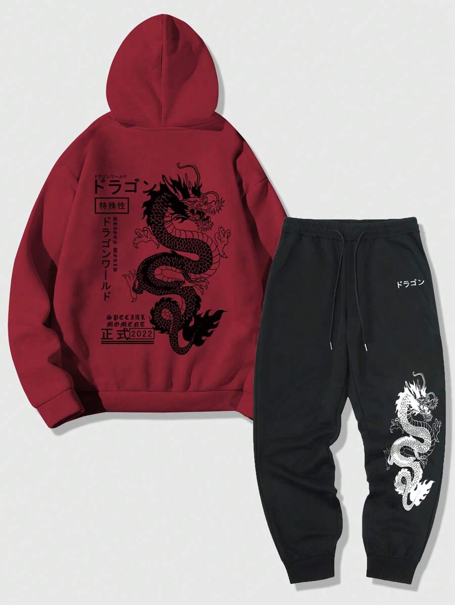 Anime Men's Chinese Dragon & Letter Print Hoodie And Pants Set