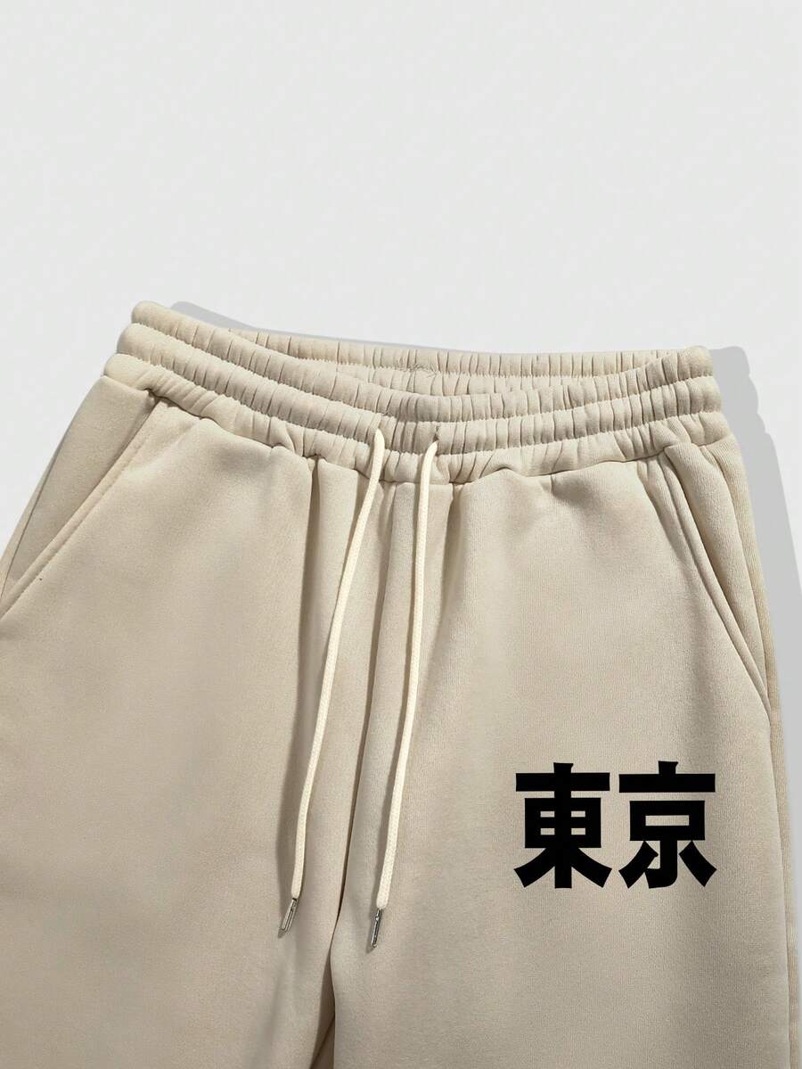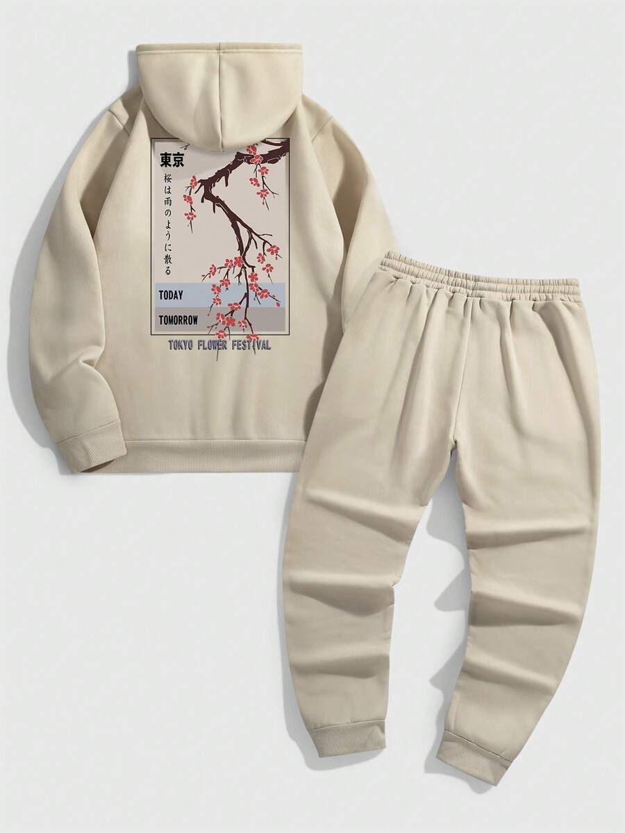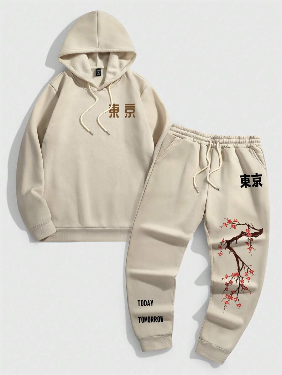 Anime Men's Letter & Flower Print Fleece Hoodie And Sweatpants Set With Drawstring, 2pcs