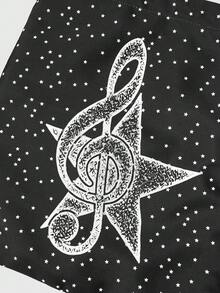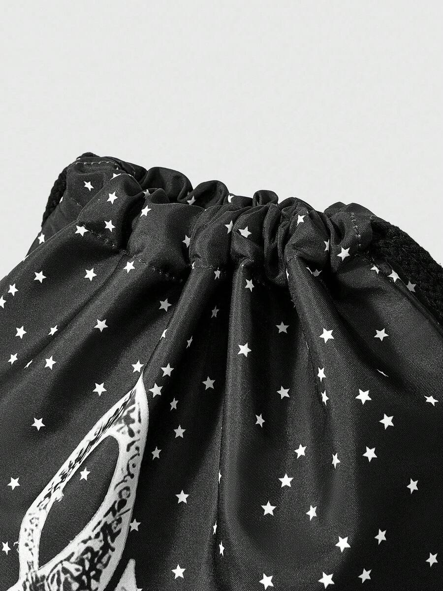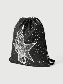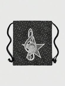Anime Music Note & Star Print Large Capacity Black Drawstring Backpack, Y2K Style Casual Daypack Suitable For School, Travel, Shopping