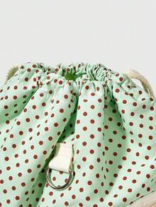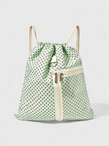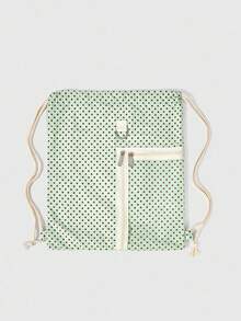 Anime Retro Green Polka Dot Drawstring Backpack With Transparent Side Zipper Pocket, Large Capacity Multi-Functional Casual Backpack Suitable For Campus, Vacation, Social, Shopping