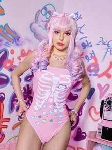 Anime Skeleton & Heart Graphic Halter One Piece Swimsuit