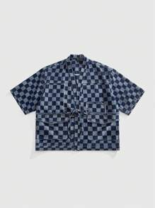 Anime Street Life Men's Checkerboard Pattern Front Tie Short Sleeve Denim Shirt, Summer