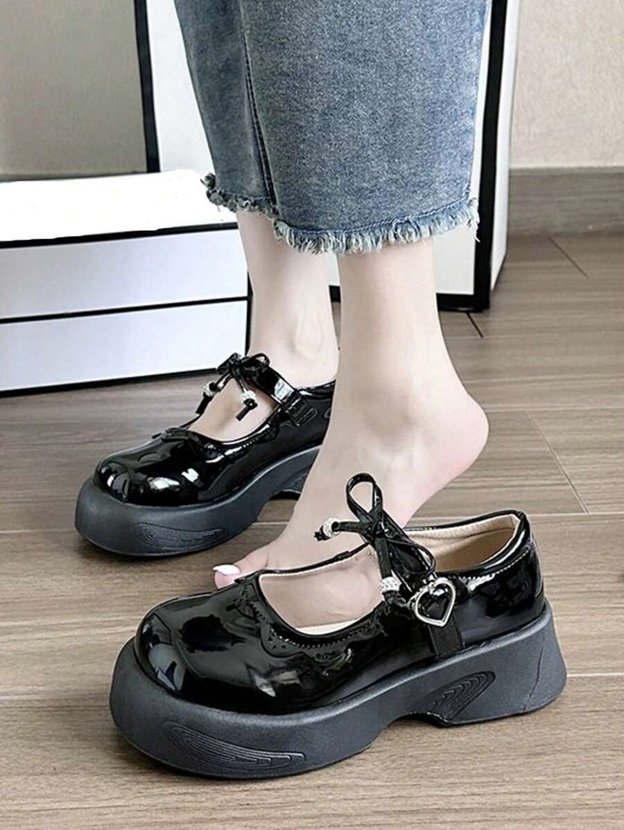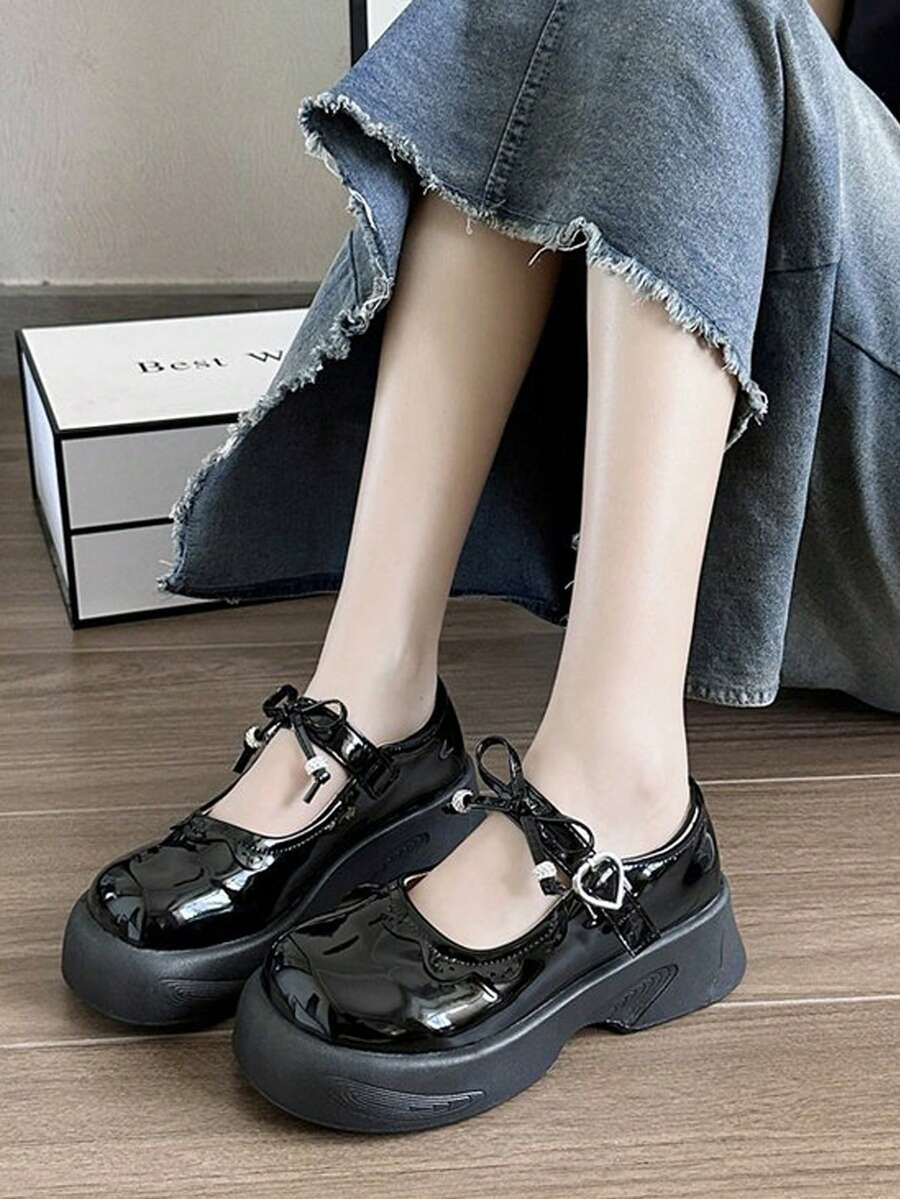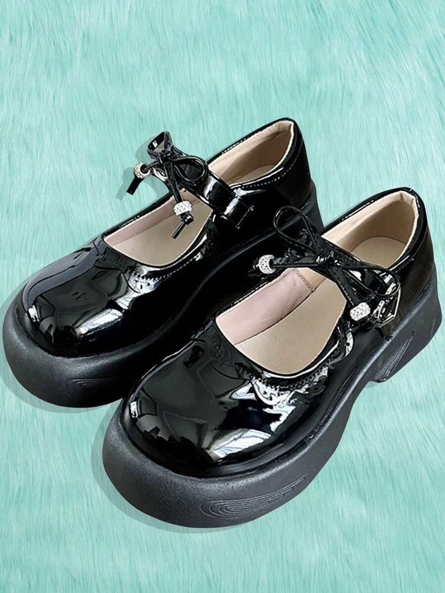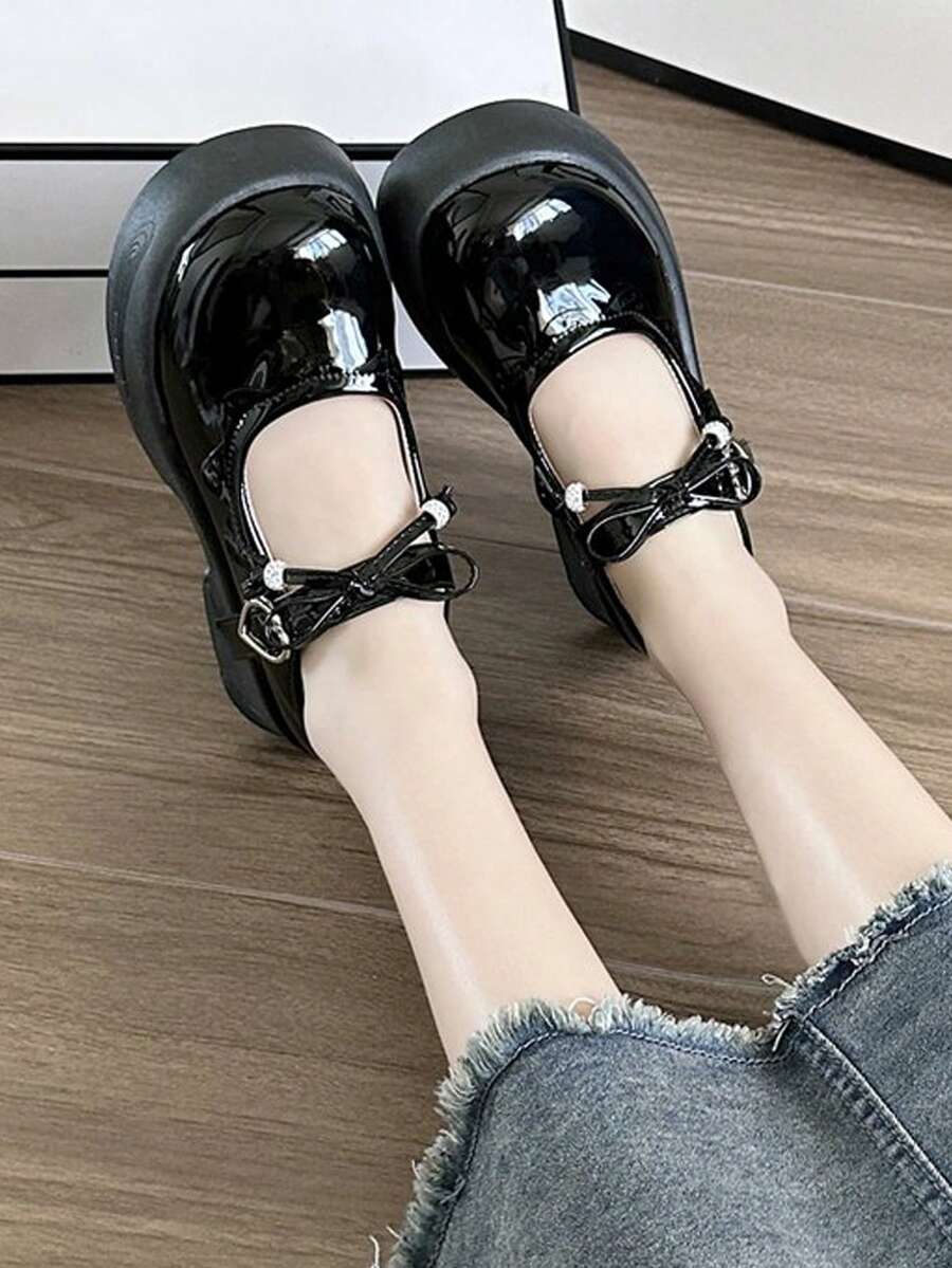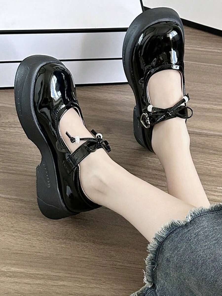 Anime Women Bow Decor Round Toe Flatform Mary Janes, Preppy Outdoor Flatform Shoes
