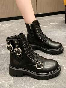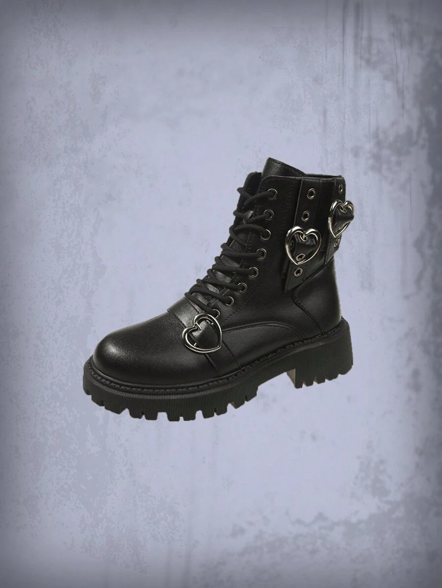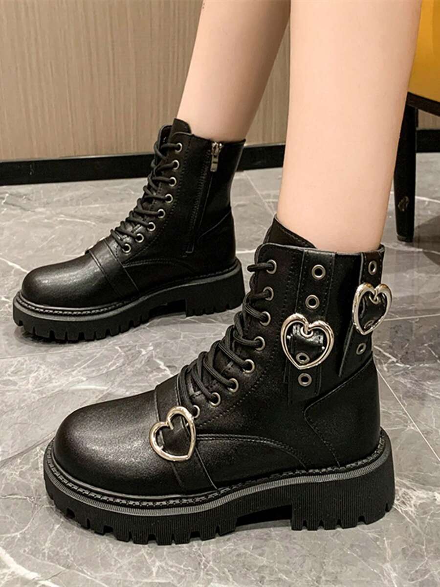 Anime Women Heart Buckle Decor Lace-up Front Combat Boots, Punk Outdoor Fashion Boots