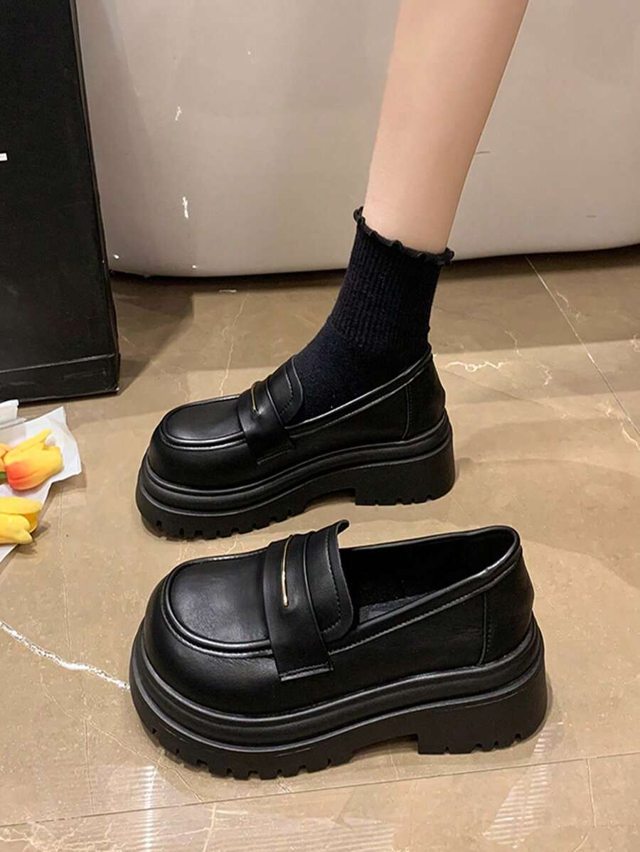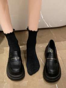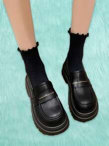 Anime Women Metal Decor Round Toe Flatform Loafers, Preppy Outdoor Flatform Shoes