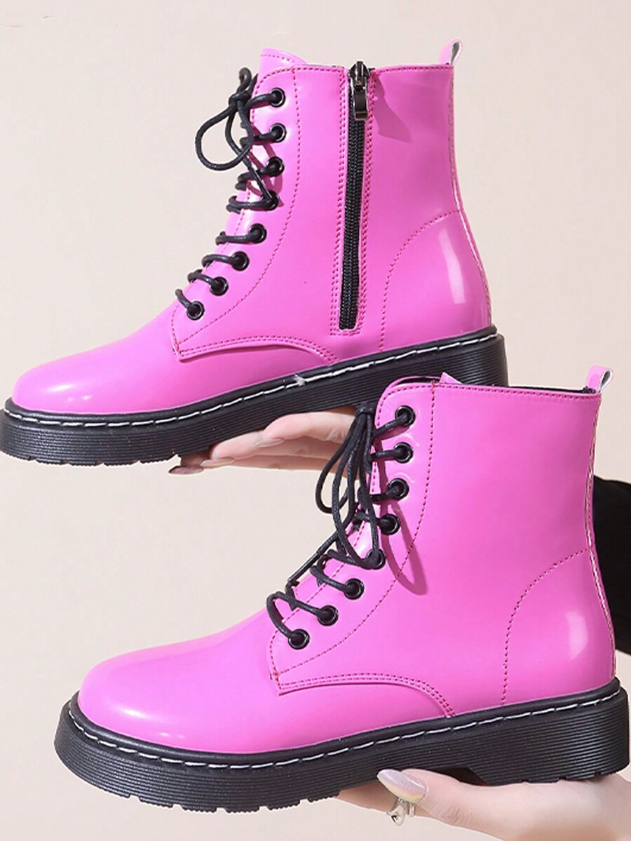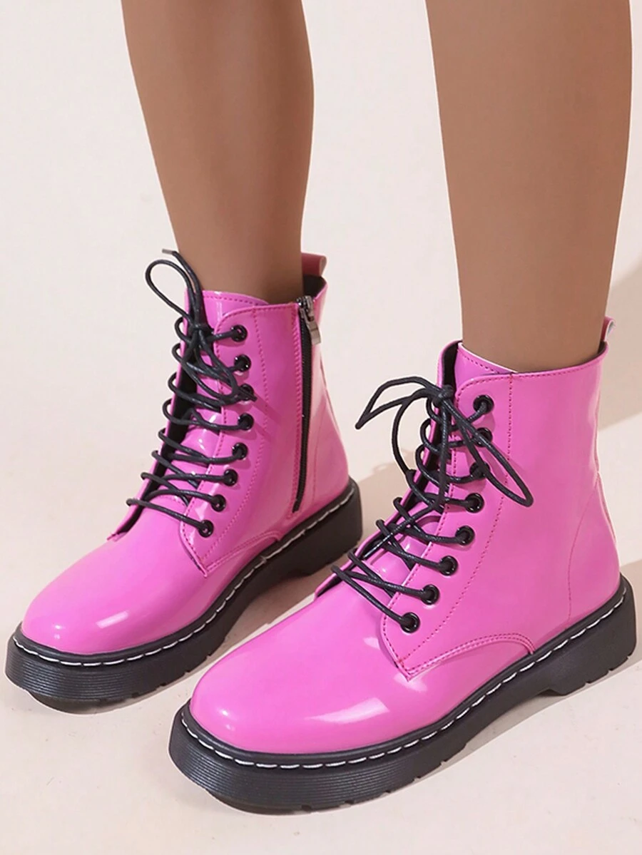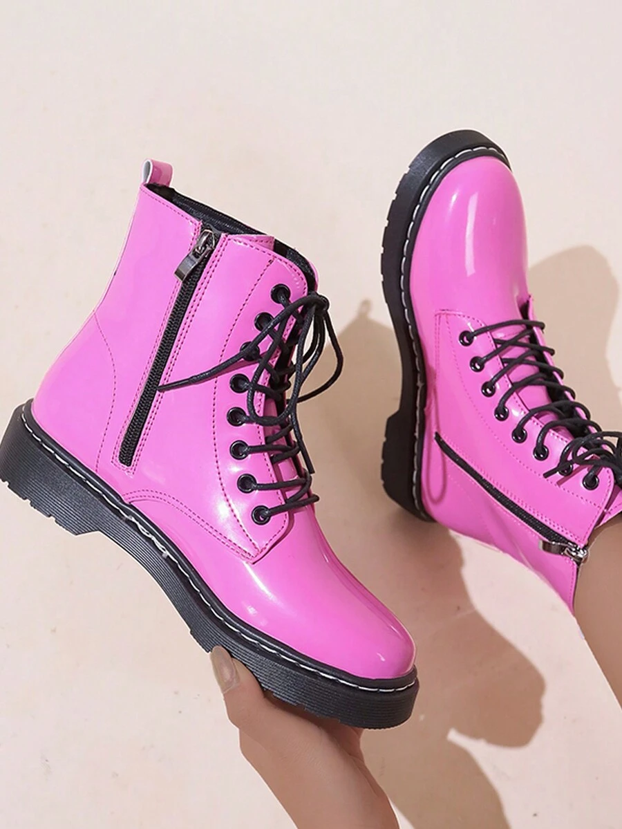 Anime Women Minimalist Side Zipper Lace Up Front Combat Boots, Funky Outdoor Fashion Boots