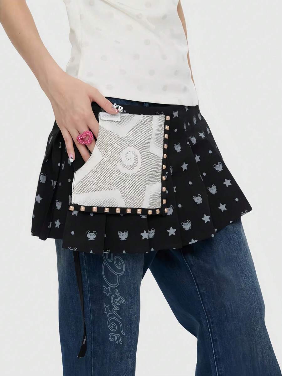 Anime Y2K Style Star And Bear Pattern Pleated Pocket Skirt Curtain Superposition - Cute Animation Style, Harajuku Street Style Wrap Skirt, Suitable For Going Out, Alternative Fashion, Women's Only