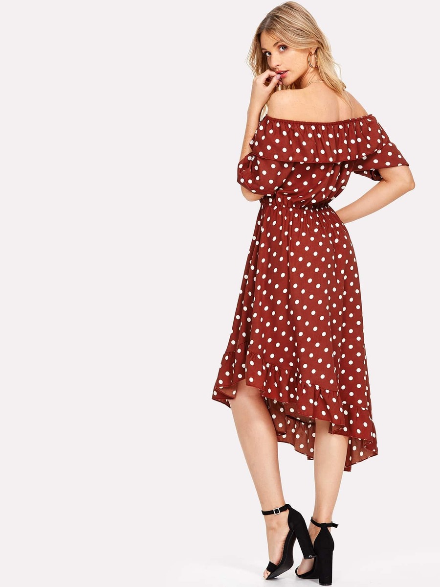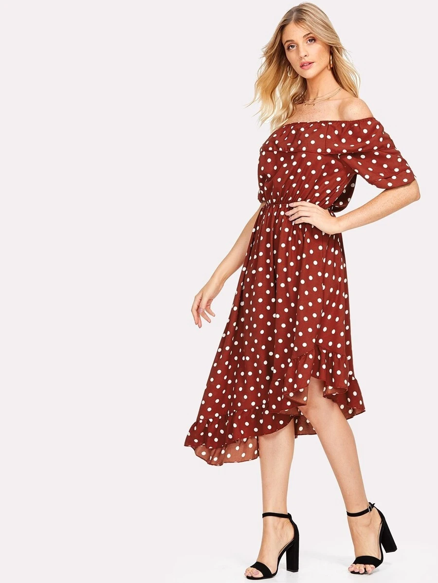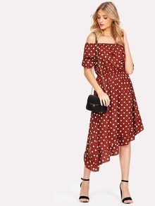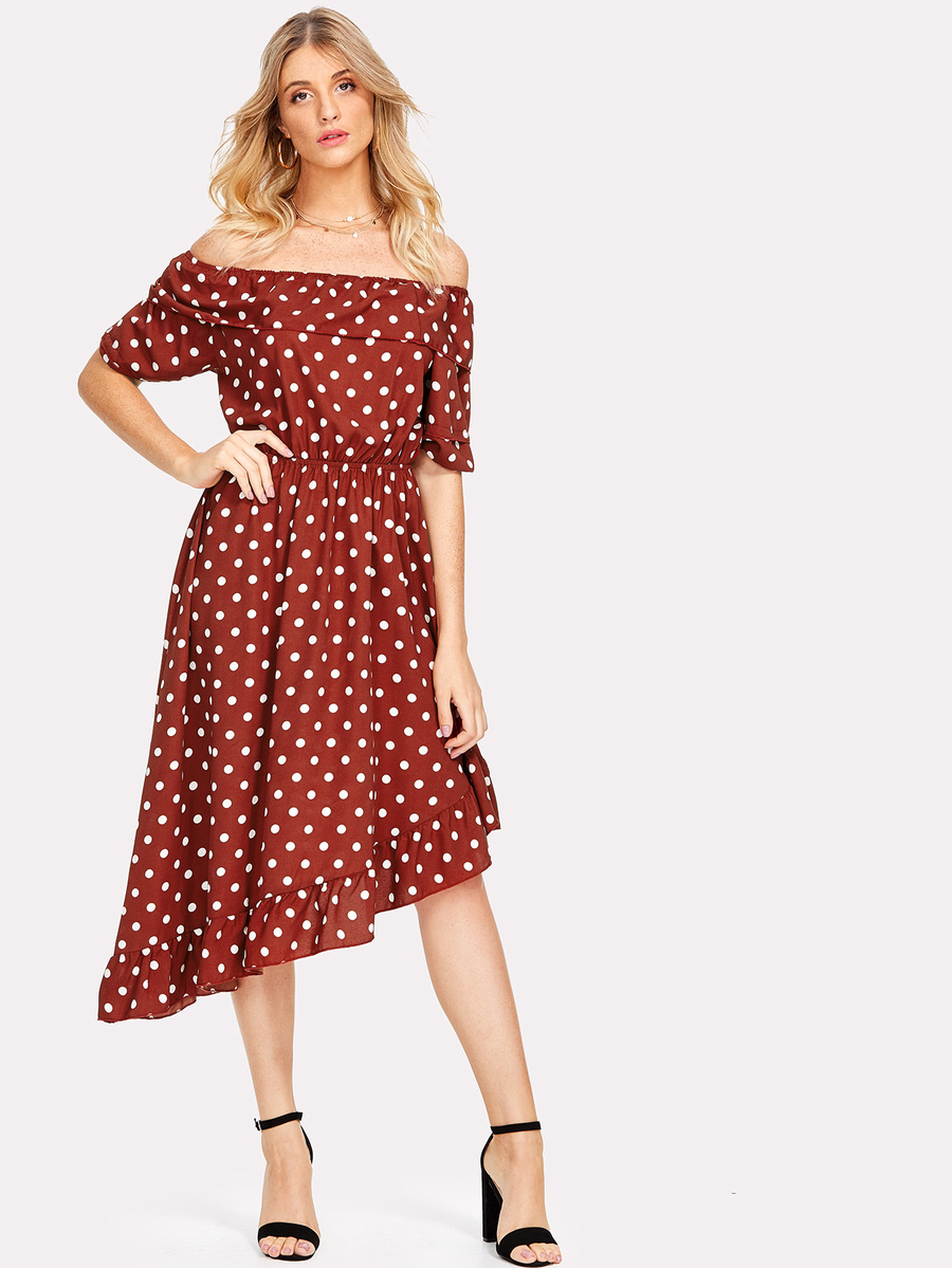 Asymmetric Ruffle Hem Polka Dot Bardot Dress