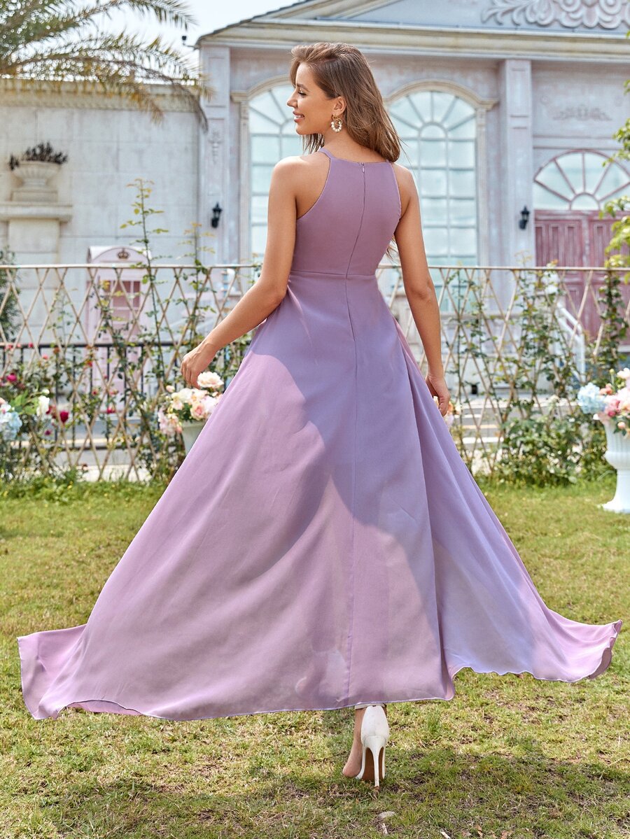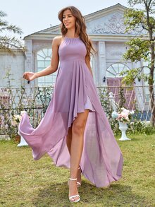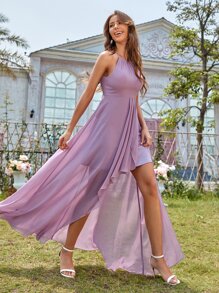Asymmetrical Chiffon Overlay High Low Halter Dress