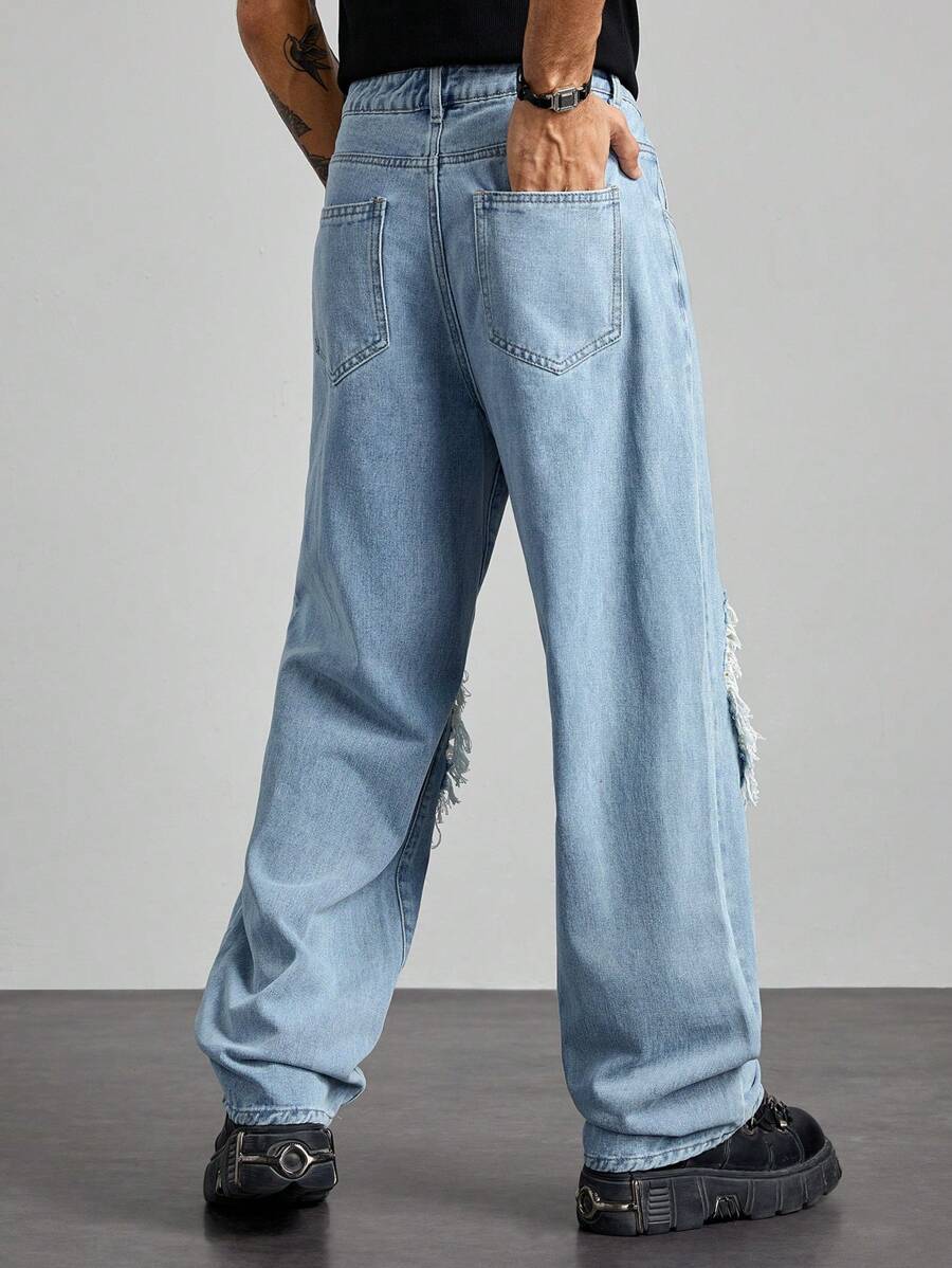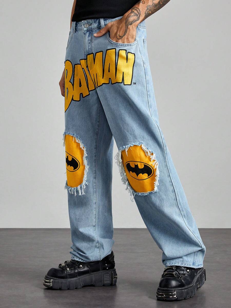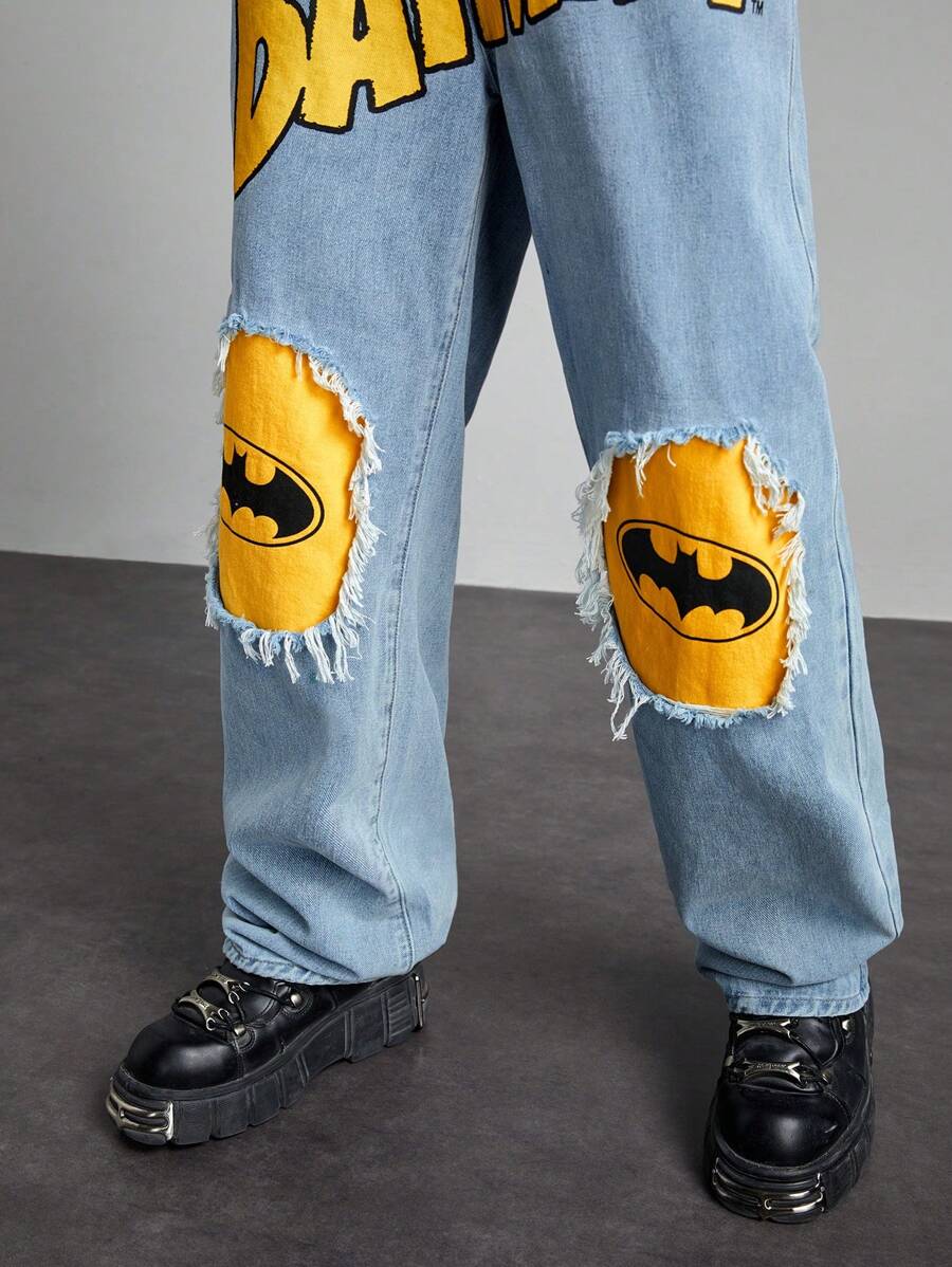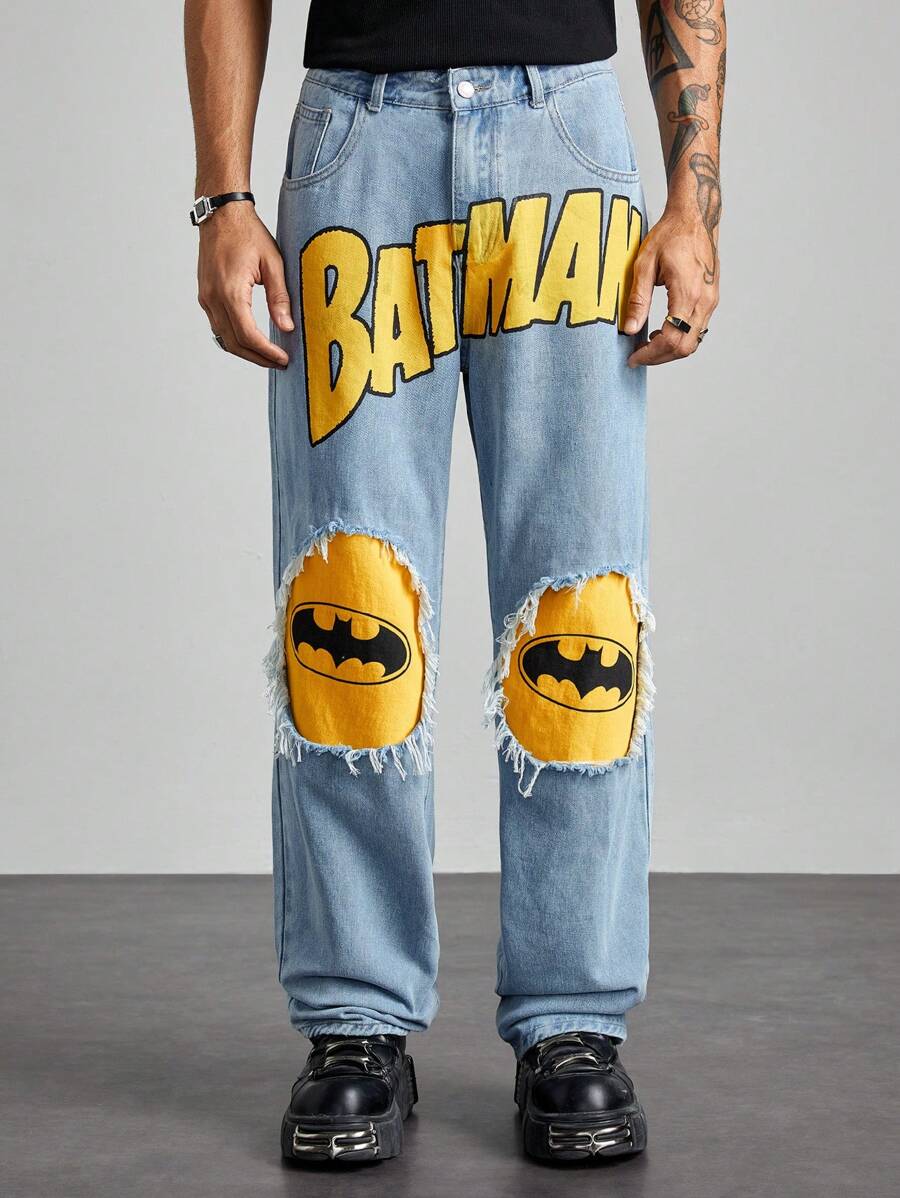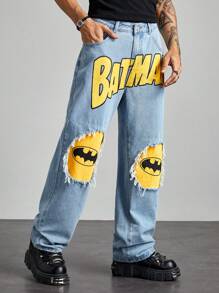 Batman X ROMWE Men's Casual Street Bat Logo & Letter Graphic Raw Trim Straight Leg Jeans