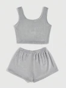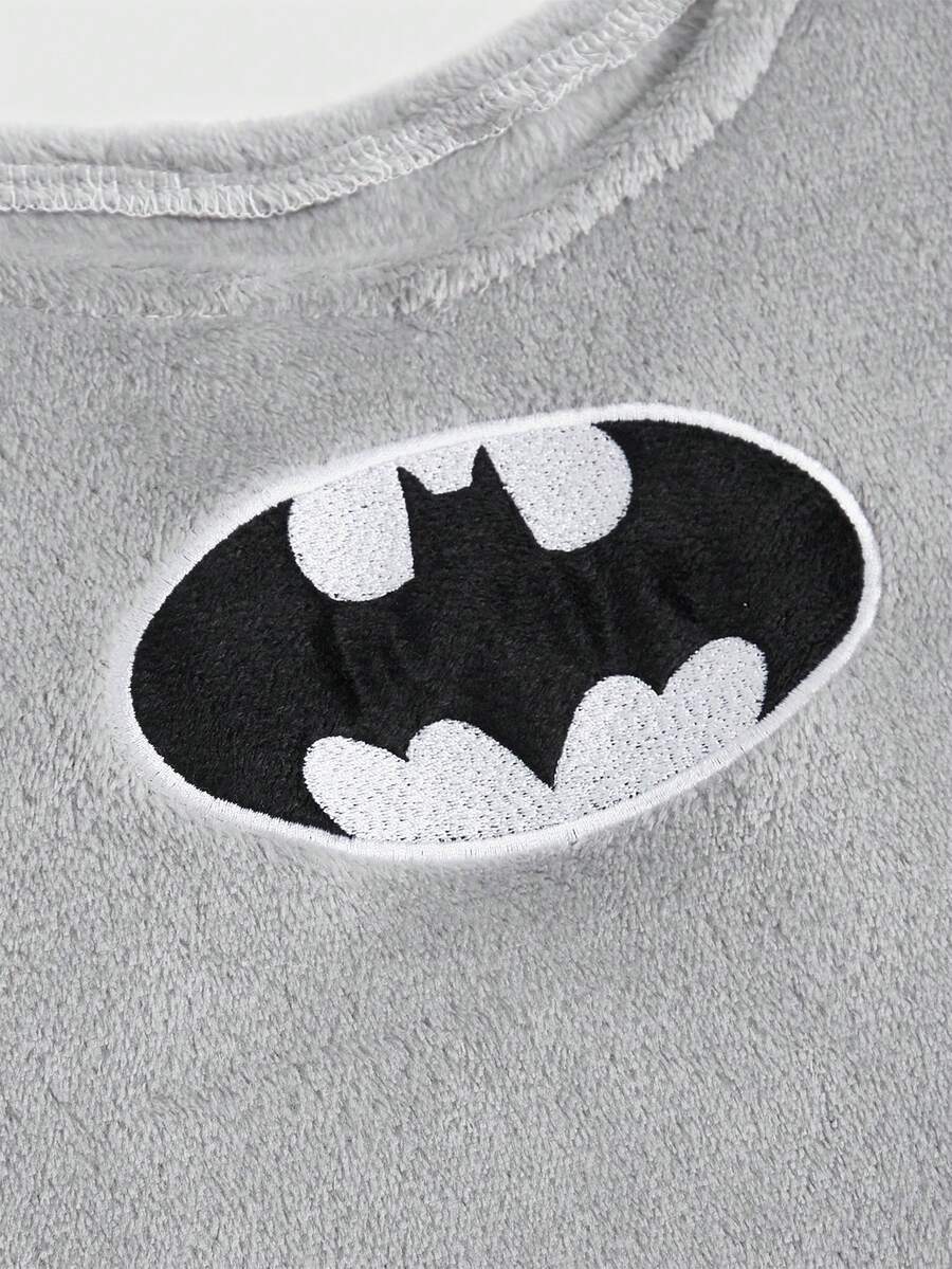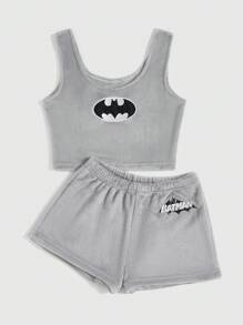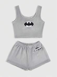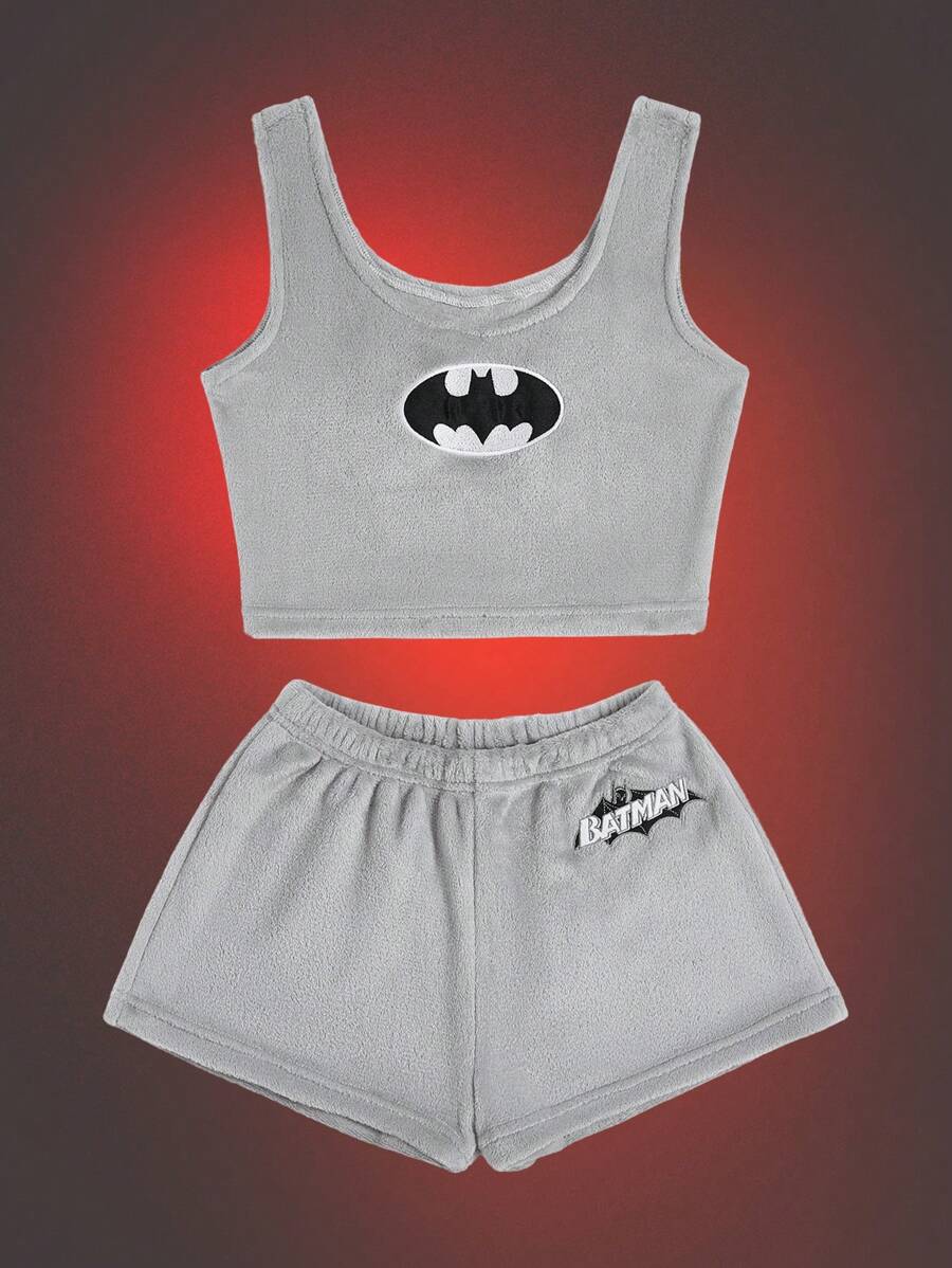 Batman X ROMWE Women's Plush Cartoon Embroidery Tank Top And Shorts Homewear Set