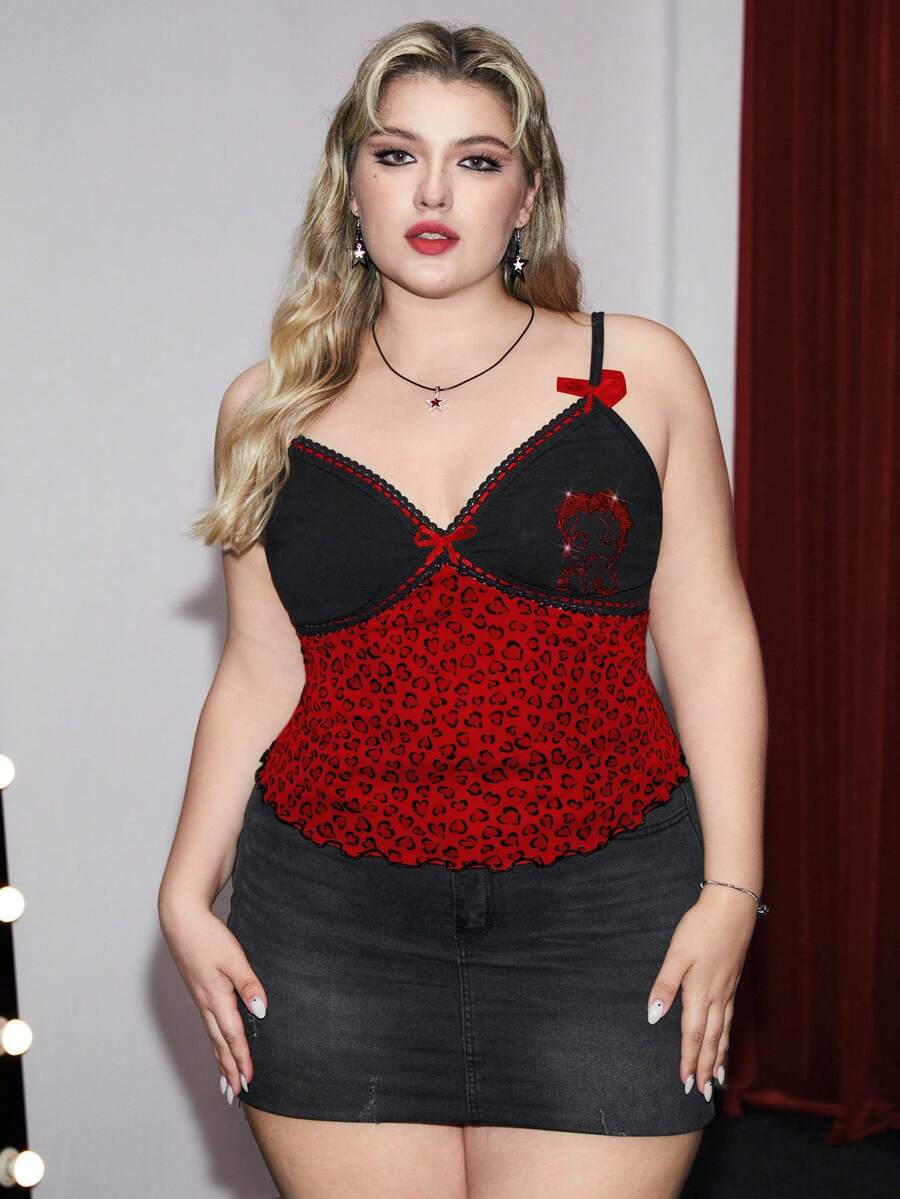 Betty Boop | ROMWE Plus Size Contrast Lace Leopard Printed Cami Top With Rhinestone Figure Pattern