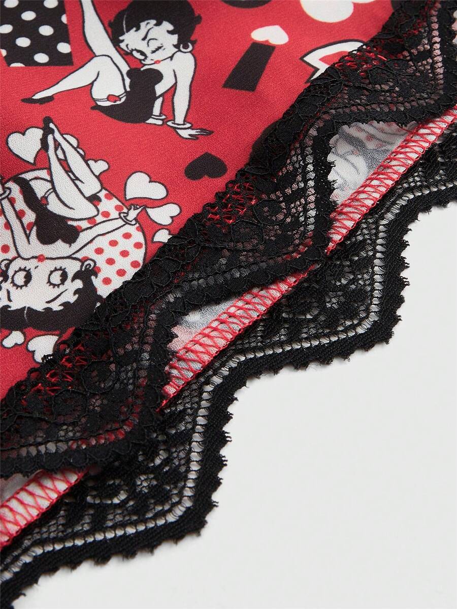 Betty Boop | ROMWE Women's Cartoon And Heart Print Contrast Bow Front Lace Hem Slip Dress