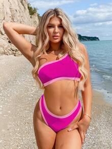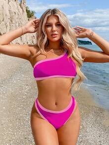 Bikinx Ribbed Bikini Set Contrast Binding One Shoulder Top & Cheeky Bottom 2 Pieces Bathing Suit Summer