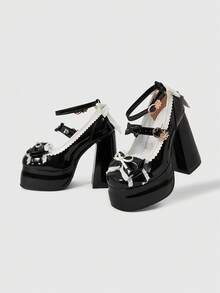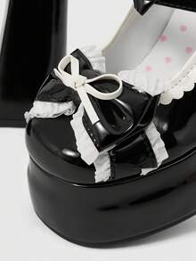 Kawaii Black High Heel Shoes Closed Toe Strap Mary Jane Pumps With Platform, Lolita Gothic Style Bow Decor Sweet JK Inspired Women Platform Heels