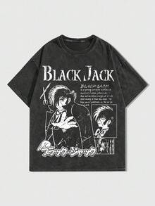 Black Jack X ROMWE Men's Casual Cartoon Figure Graphic & Slogan Graphic Washed Loose Fit T-Shirt, Summer