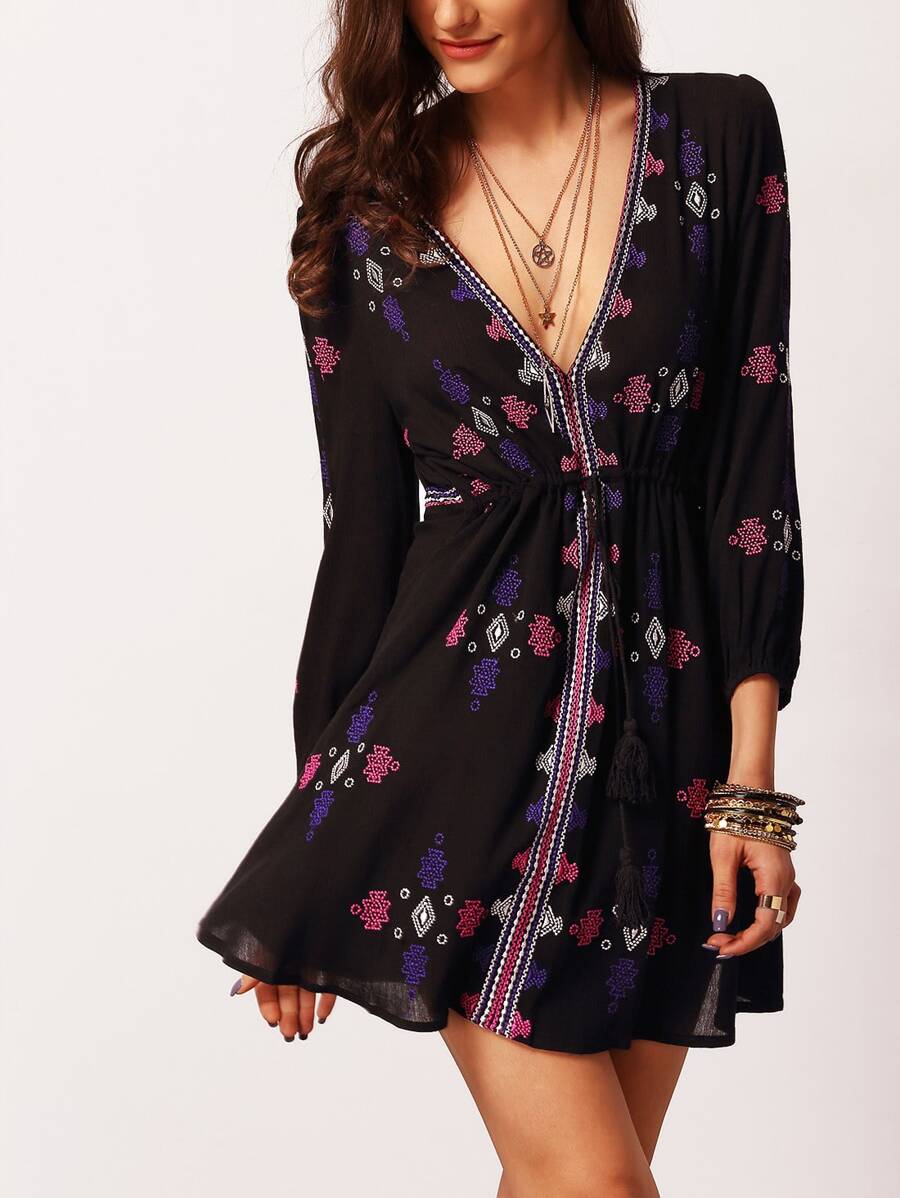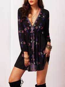 Black Long Sleeve V Neck Vintage Print Dress