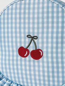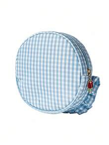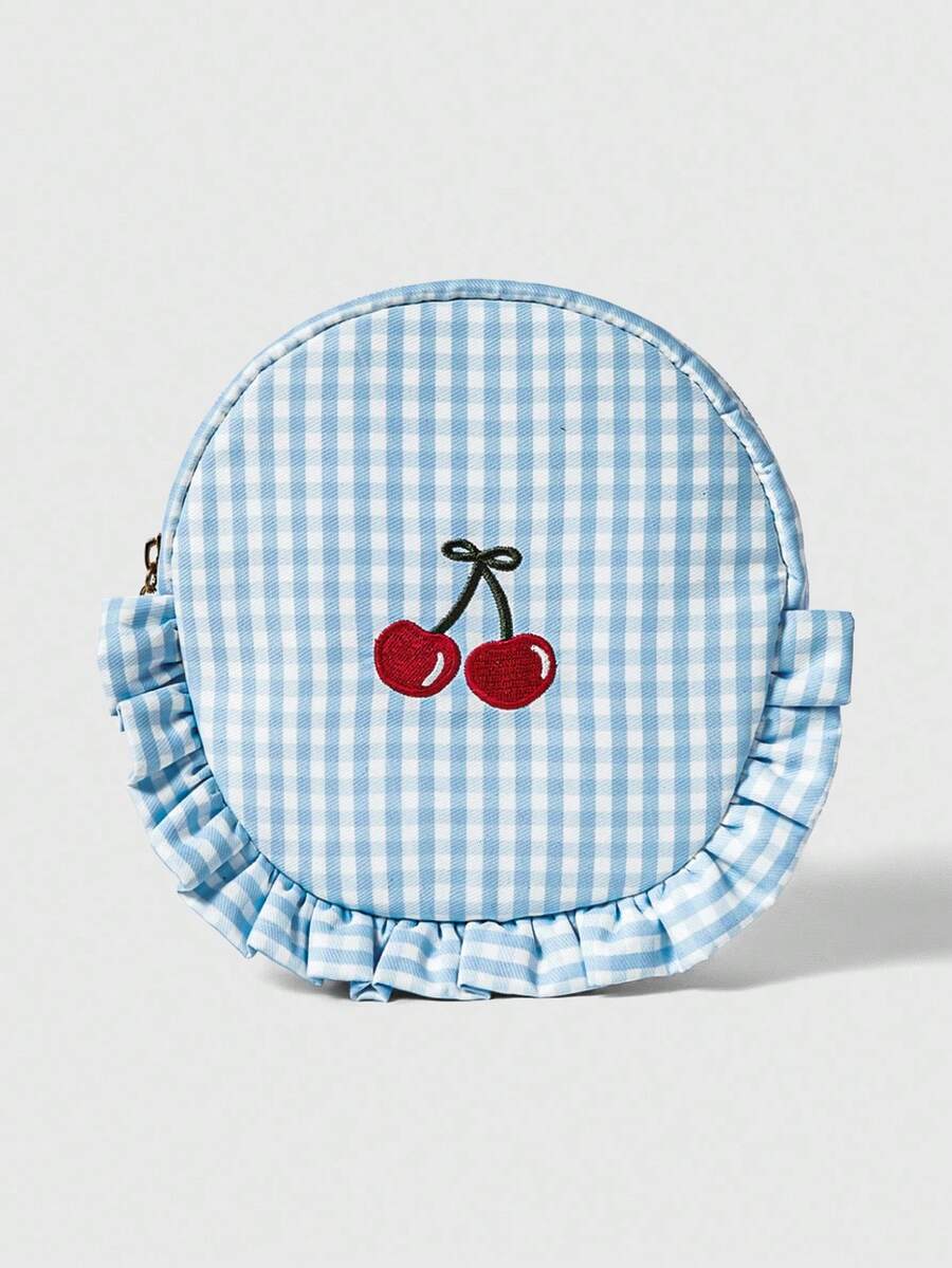 Kawaii Blue Plaid Embroidered Cherry Pattern Round Lace Large Capacity Portable Cosmetic Bag