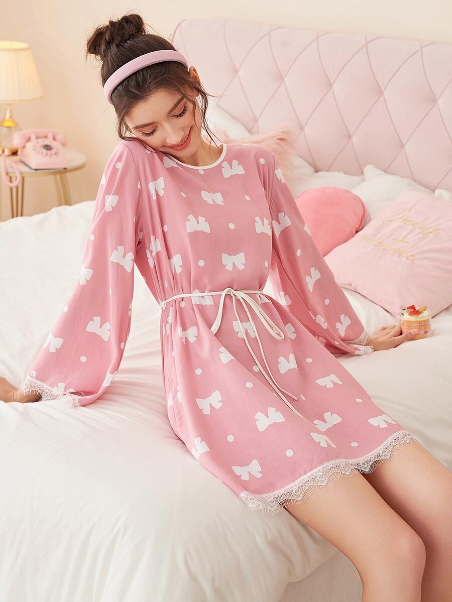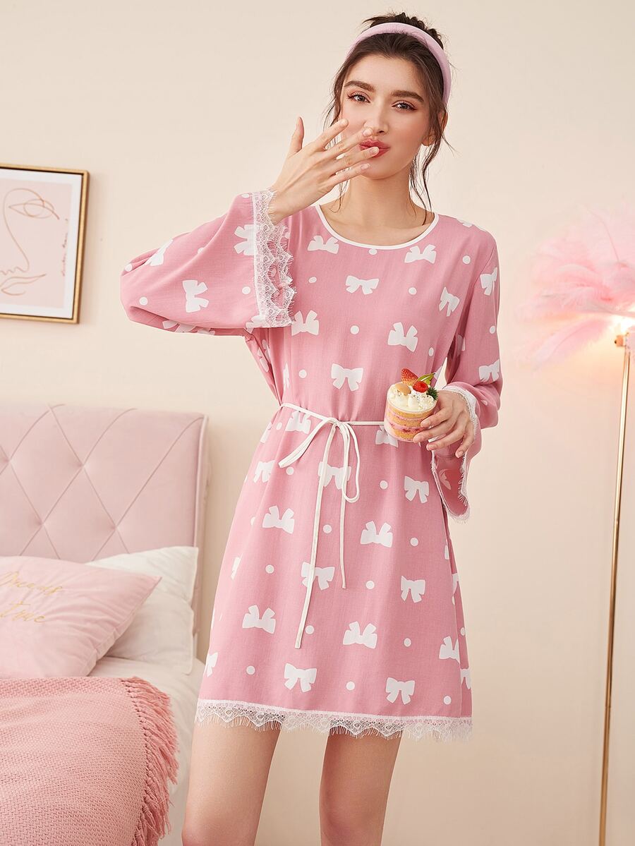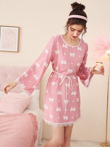 Bow And Polka Dot Print Lace Trim Belted Sleep Dress