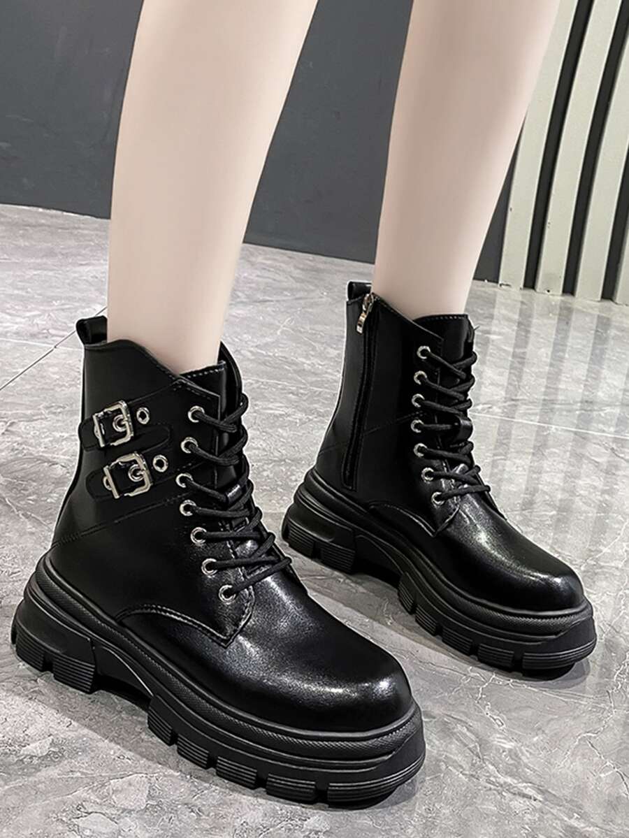 Buckle Decor Lace-up Front Combat Boots
