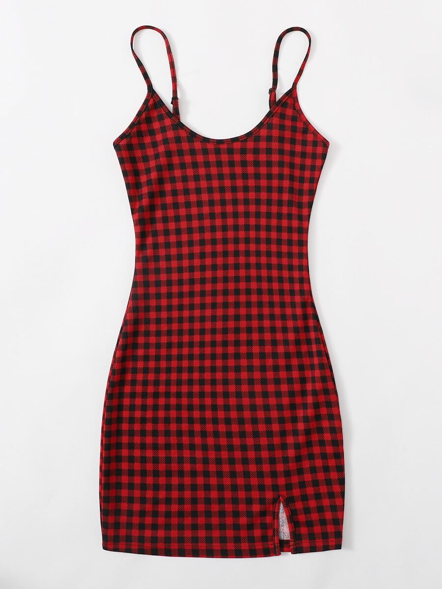Buffalo Plaid Slit Cami Bodycon Mini Dress