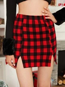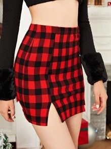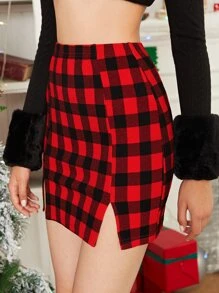 Buffalo Plaid Slit Hem Bodycon Skirt