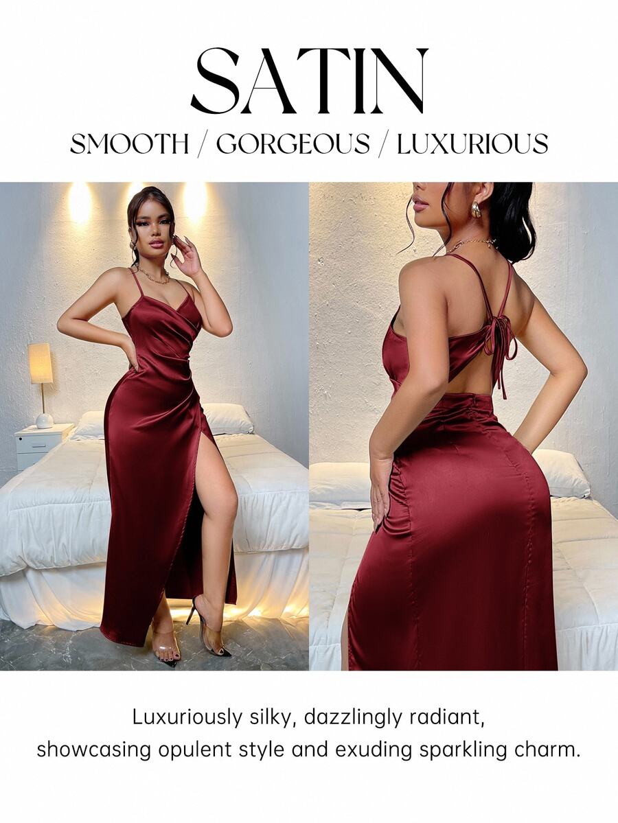 Burgundy Red Back Tie Pleated Side Wrap Hem Slit Satin Camisole Elegant Wedding Guest Dress,Summer Dresses For Women,Tea Party Dress