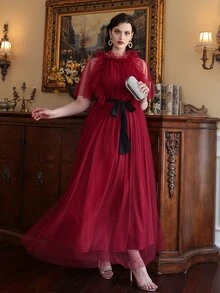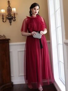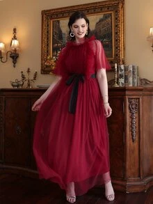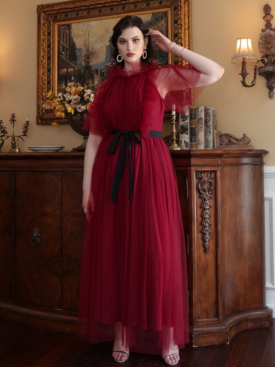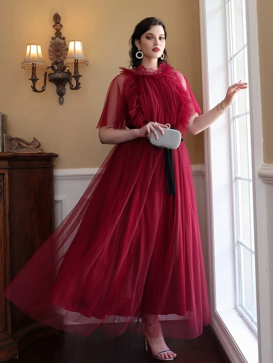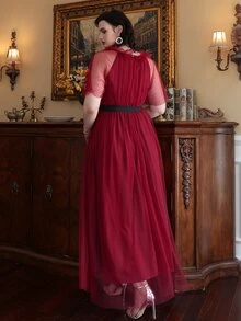 Burgundy Red Plus Dobby Mesh Ruffle Trim Belted Prom Dress