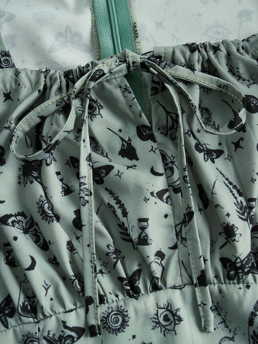 Fairycore Butterfly & Sun Print Tie Front Ruched Bust Dress
