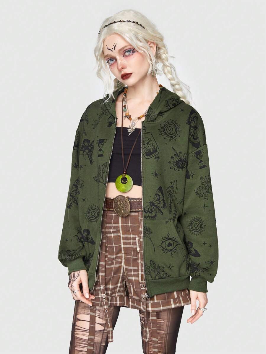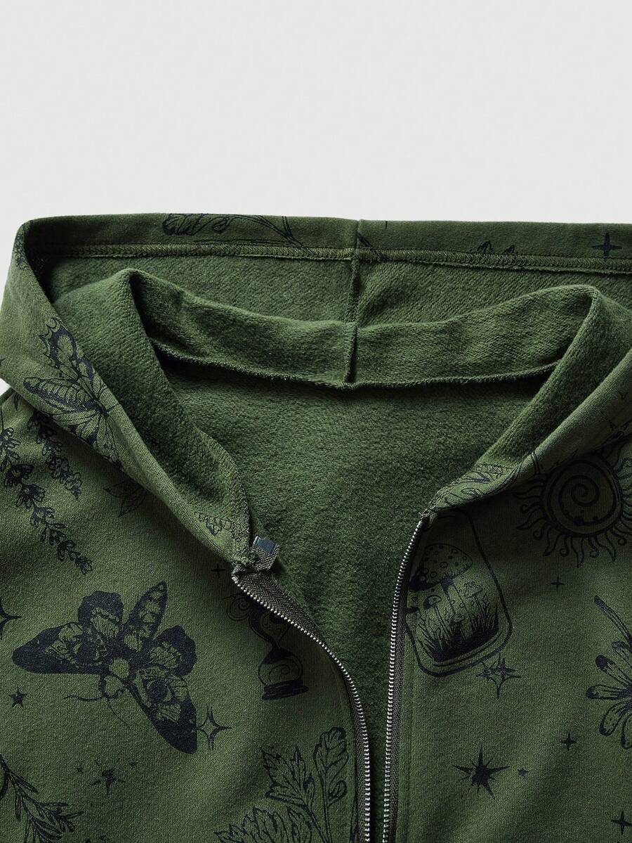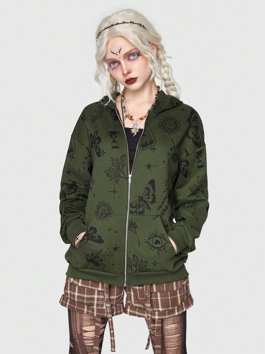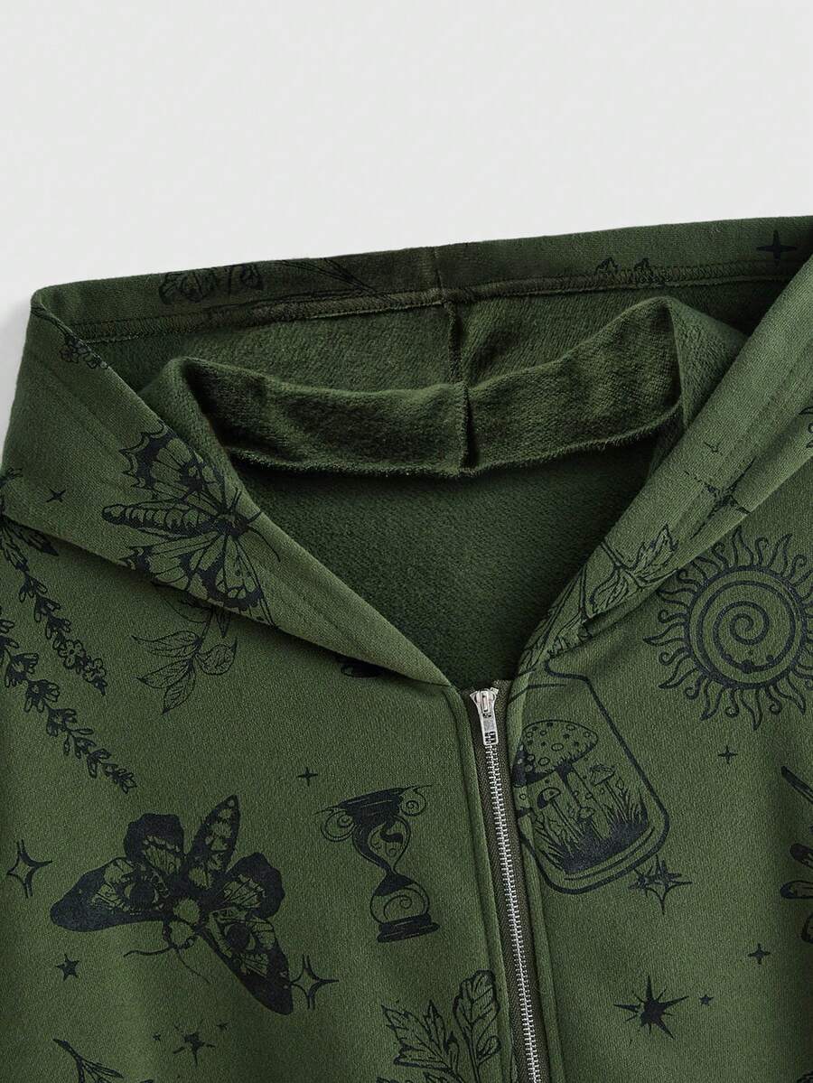 Fairycore Butterfly & Sun Print Zip Up Drop Shoulder Hoodie