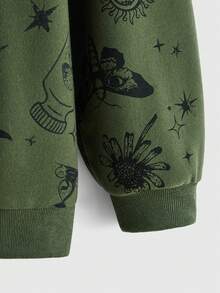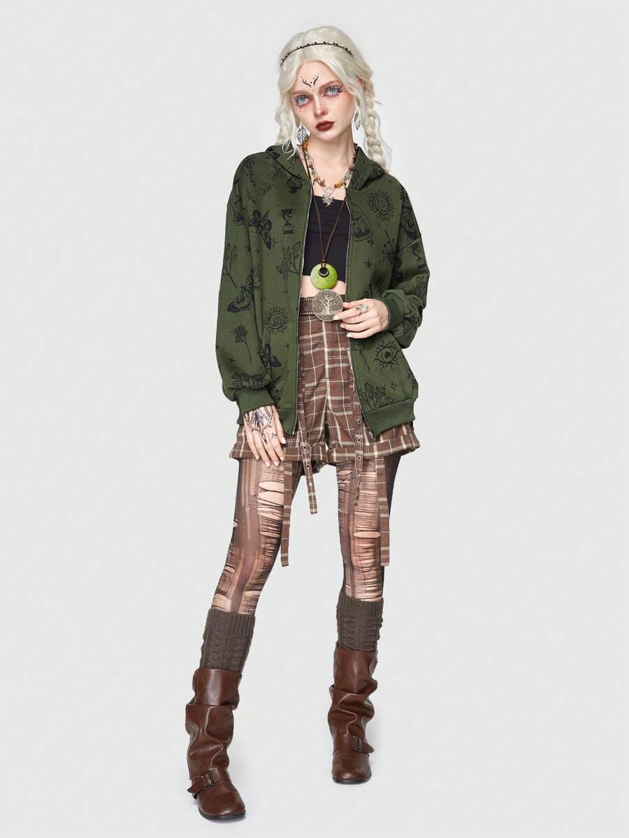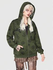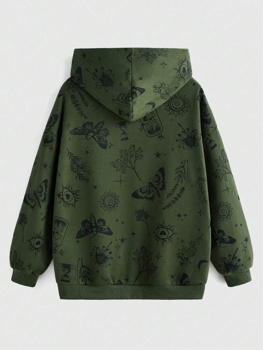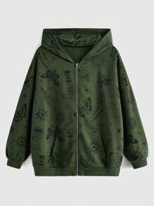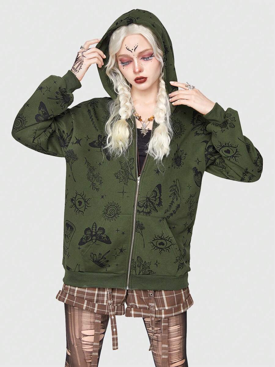 Fairycore Butterfly & Sun Print Zip Up Drop Shoulder Hoodie