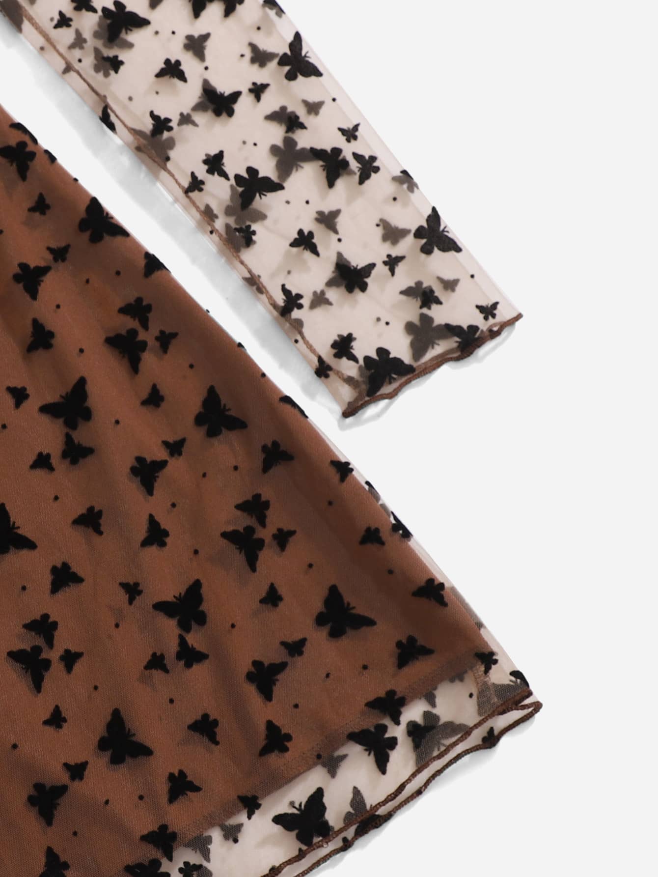 Butterfly Graphic Contrast Mesh Drawstring Ruched Cut Out Dress