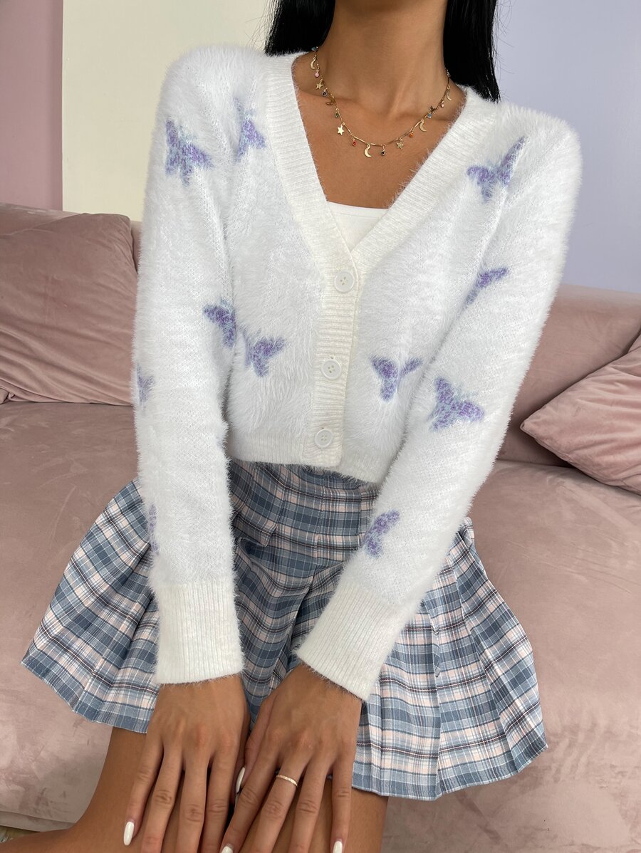 Butterfly Pattern Fluffy Knit Button Front Cardigan