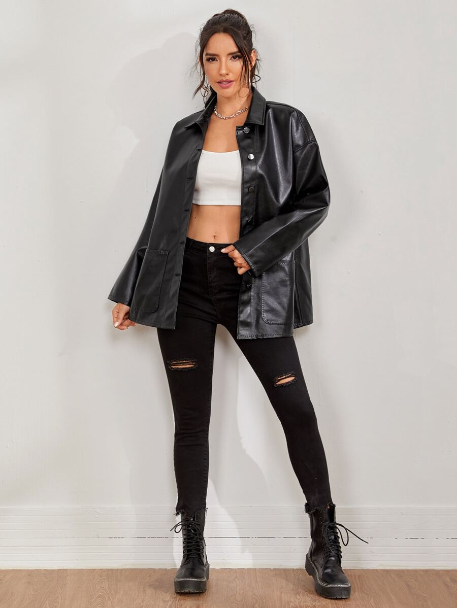 Button Front Drop Shoulder PU Leather Coat,Ladies Late Fall Casual Button Drop Shoulder Collar Regular Fit Black Plain Women Coats,Casual Daily Wear