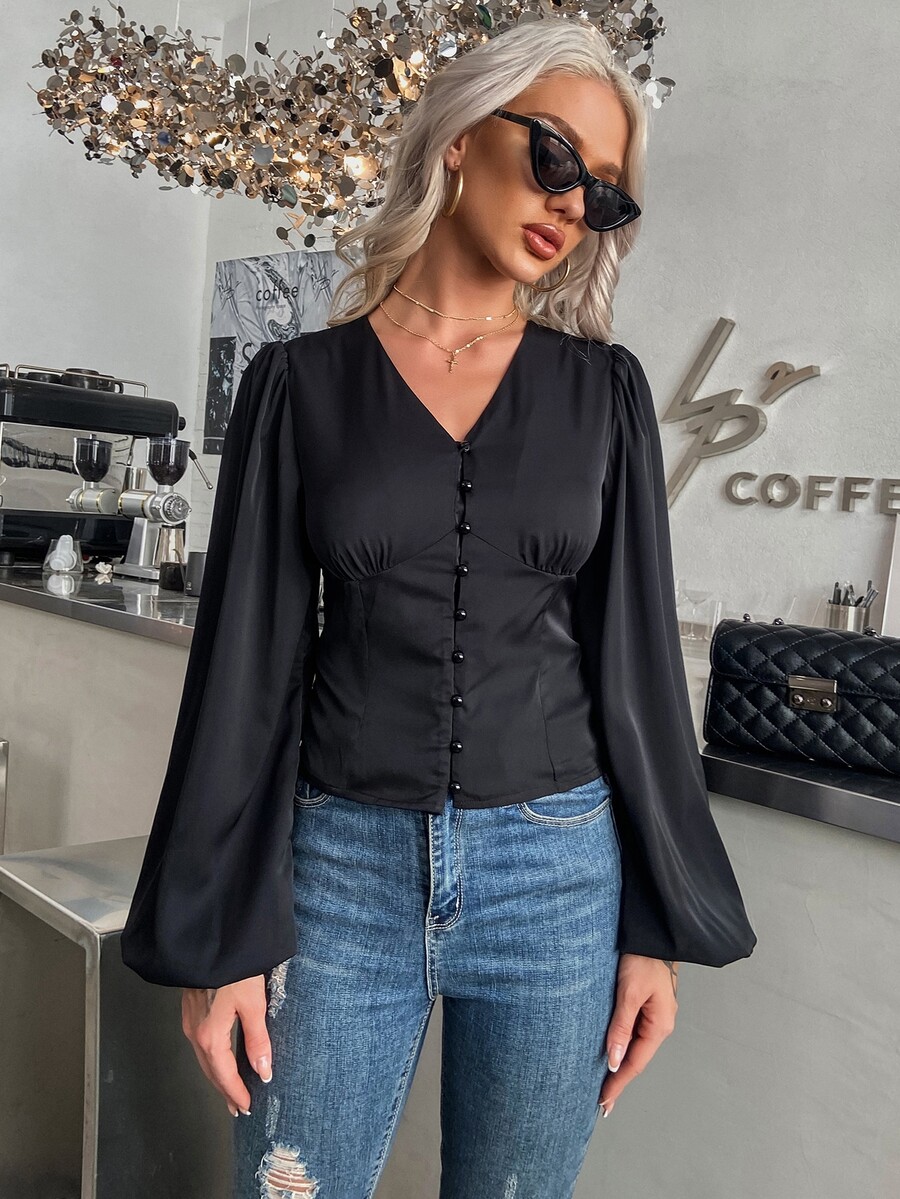 Button-Front Long Bishop Sleeve Top