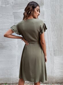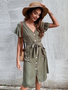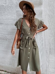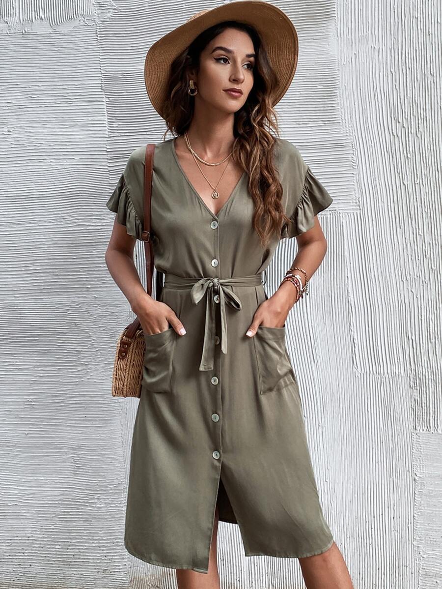 Button Up Belted Solid Dress