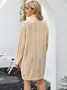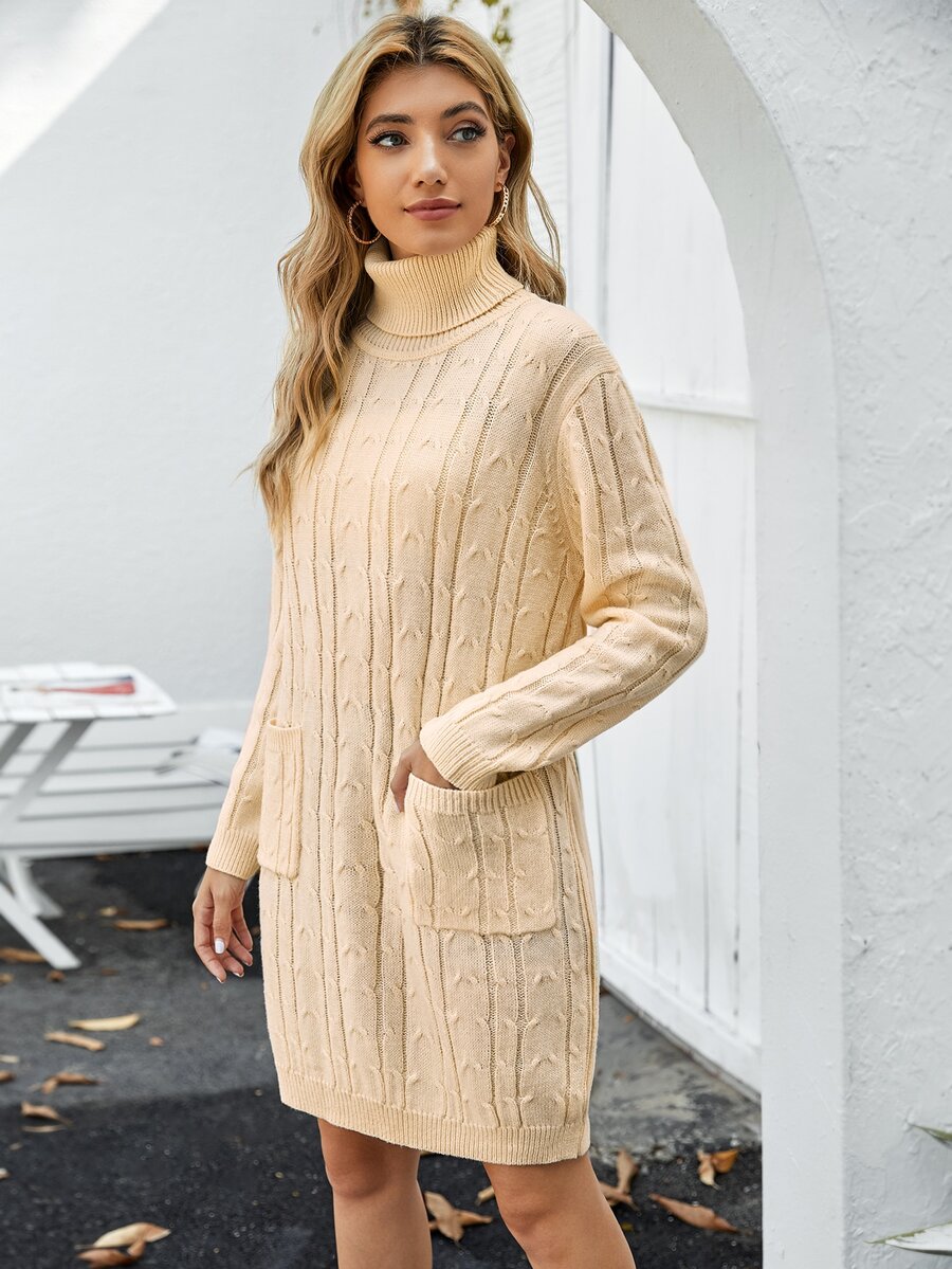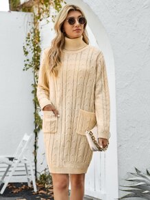 Cable Knit Turtleneck Dual Pocket Sweater Dress